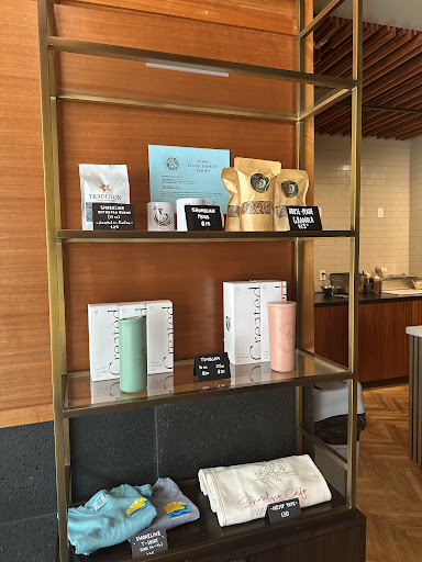 The view through those expansive windows? Chain stores and tour buses. The ambient noise? Urban traffic and the gentle hum of central air conditioning. These should be deal-breakers, but somehow aren't. The retail section hawks the predictable suspects—branded tote bags, baseball caps, local granola—displayed on brass shelving punctuated by real succulents that seem almost apologetic next to their plastic cousins overhead.