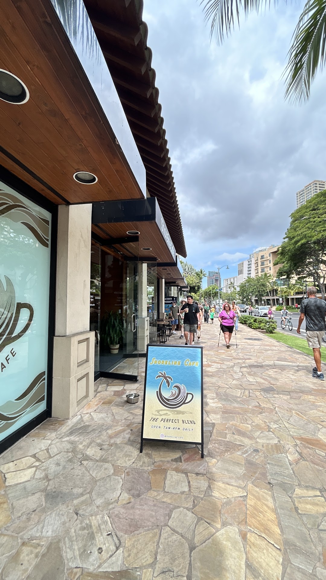 Dozens of fake ferns dangle from Shoreline Cafe's ceiling like a suburban mall's fever dream of the Amazon. This is Waikiki's newest Instagram sanctuary, where carefully curated jungle canopy meets the inescapable reality of Kalakaua Avenue traffic rumbling just beyond floor-to-ceiling windows.