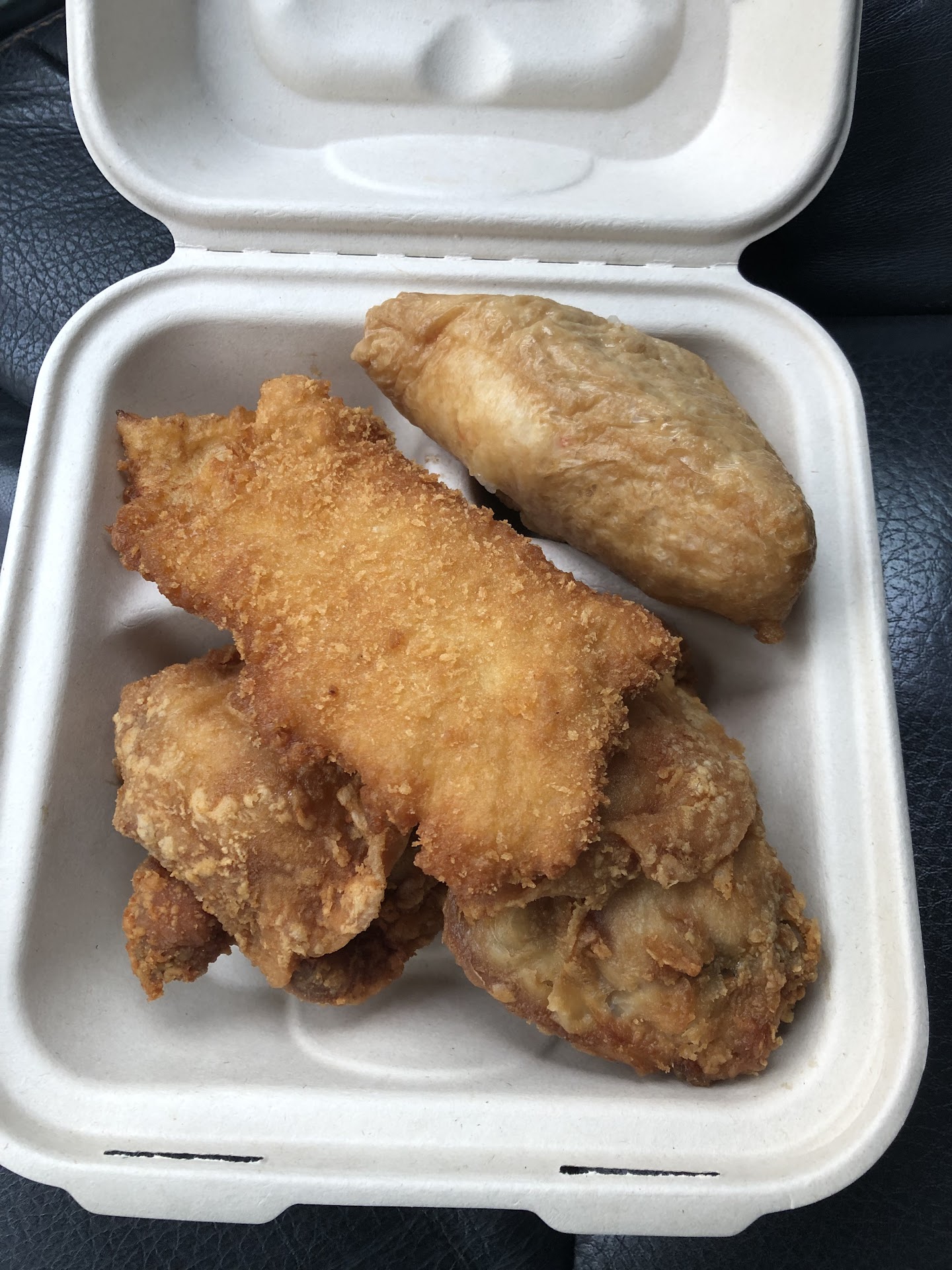 4/21/21 Pre-workout ritual - musubi, luncheon meat, 3 fried chix. Who serves luncheon meat anymore? They do!