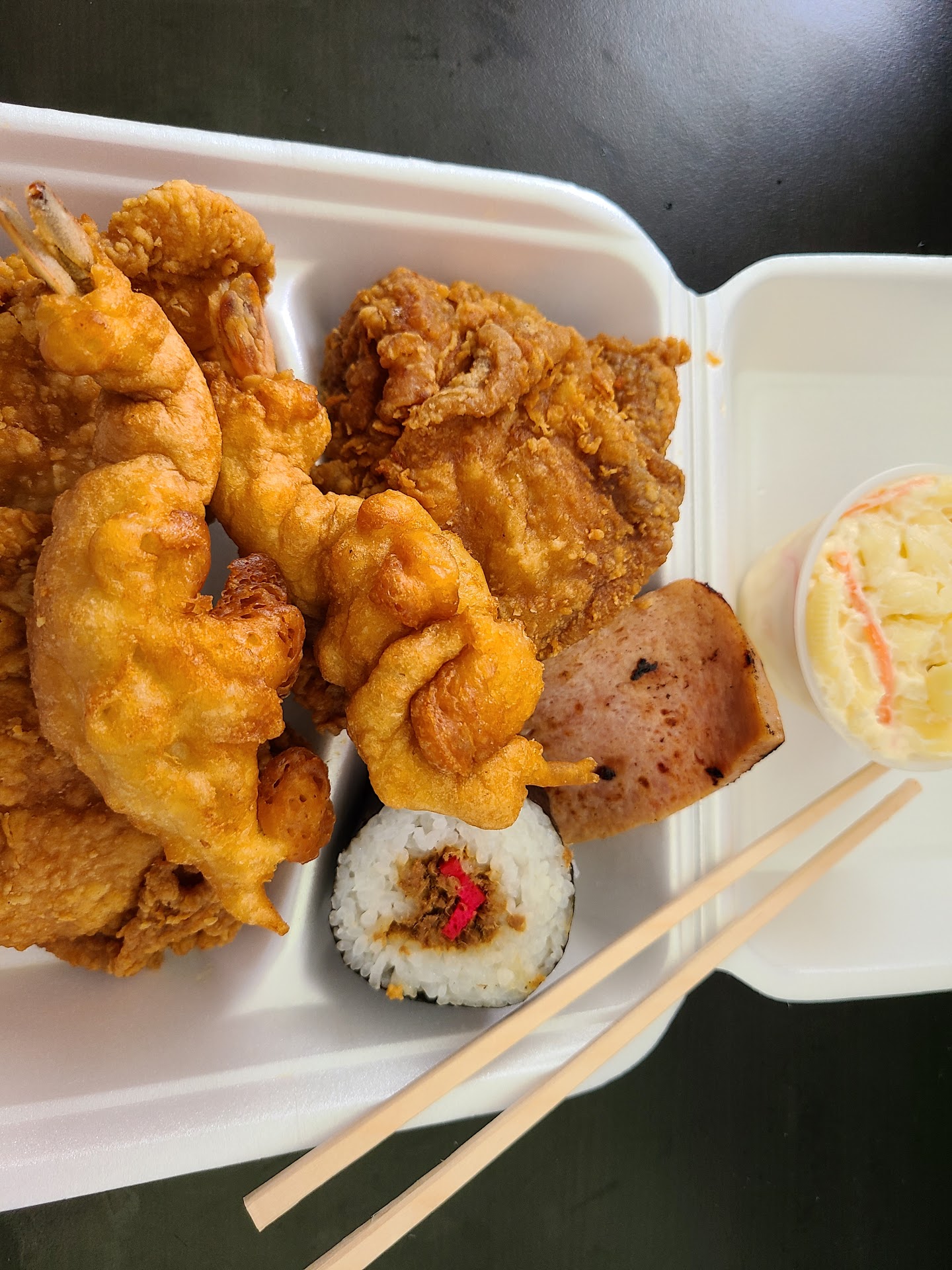 Wow, I'm surprised I didn't have to break the bank at this okazuya! The food was so ONO!!! They have the basics, nothing too extravagant, but enough to have good variety. Because I'd have to travel before eating I ordered 2 plates. 1st was the "wet" foods 2nd was the "dry" foods, I almost ordered 1 of everything available. 3 reasons for the 4 star rate: The hash patties were dry I guess because its mostly potato, I prefer traditional えぴ shrimp tempura, and TBH I was craving the square egg omelet but they didn't have any egg dishes nor did they have なますnamasu. The にしめ nishime was cooked through yet it was nice and firm and served in it's sauce, the tofu was great, and the shoyu chicken was juicy. But the fried chicken, OMG the fried chicken! It is now in my top 10 list! There was a misunderstanding, unfortunately I didn't get to try one of my favorite dishes, long rice. I'll be...
