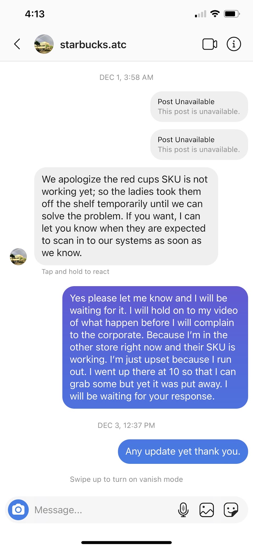 …and when they gave me my coffee it wasn’t the right order… but I’m not one to cause a scene so I left and came on here to vent.