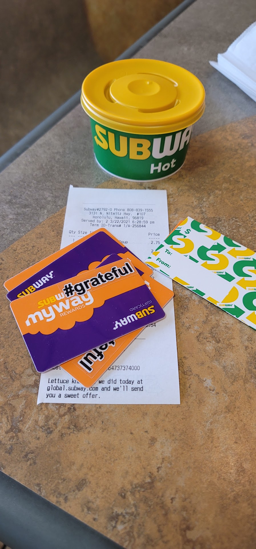 Ā Ā Ā Read moreMy friend picked it up and said they were quite rude. When asking for chicken breast the response was āSubway doesnāt have chicken breast.ā Iāve gotten the same sandwich for about 6 years, so unless it just changed⦠excuse me? It also couldāve been said more nicely like āoh Iām sorry, thatās no longer on the menu.ā My bread tasted pretty stale/hard on one side and super soggy on the other. My sandwich completely fell apart by the last few bites. My brother normally goes to the location by Safeway even though this is closer. Now I know why. Not coming back to this one. $23 for a very mediocre 6 inch and footlong meal was a rip off. If I hadnāt just got off an airplane Iād go buy my own ingredients and make a bunch of much cheaper, healthier, and tastier...