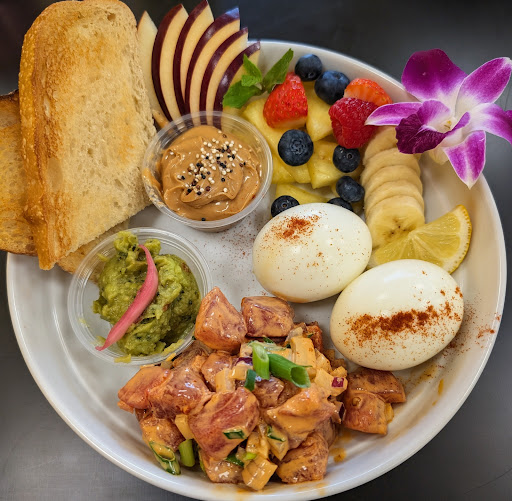 Now letâs talk about the food⌠I got the pokĂŠ breakfast plate and wow. Just wow. Fresh, flavorful, and beautifully presented. This is how you start a day right. Perfectly seasoned pokĂŠ, hard-boiled eggs dusted with paprika, fresh fruit, creamy peanut butter, guacamole, toasted bread⌠every bite was satisfying and intentional. And yes, they included a flower, because why not add a little aloha to your morning?