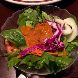 Salad Simple green leaf salad topped with a slice of tomato, sliced cucmbers, shredded carrots & purple cabbage under a tangy/savory orange colored dressing. Good but nothing special.