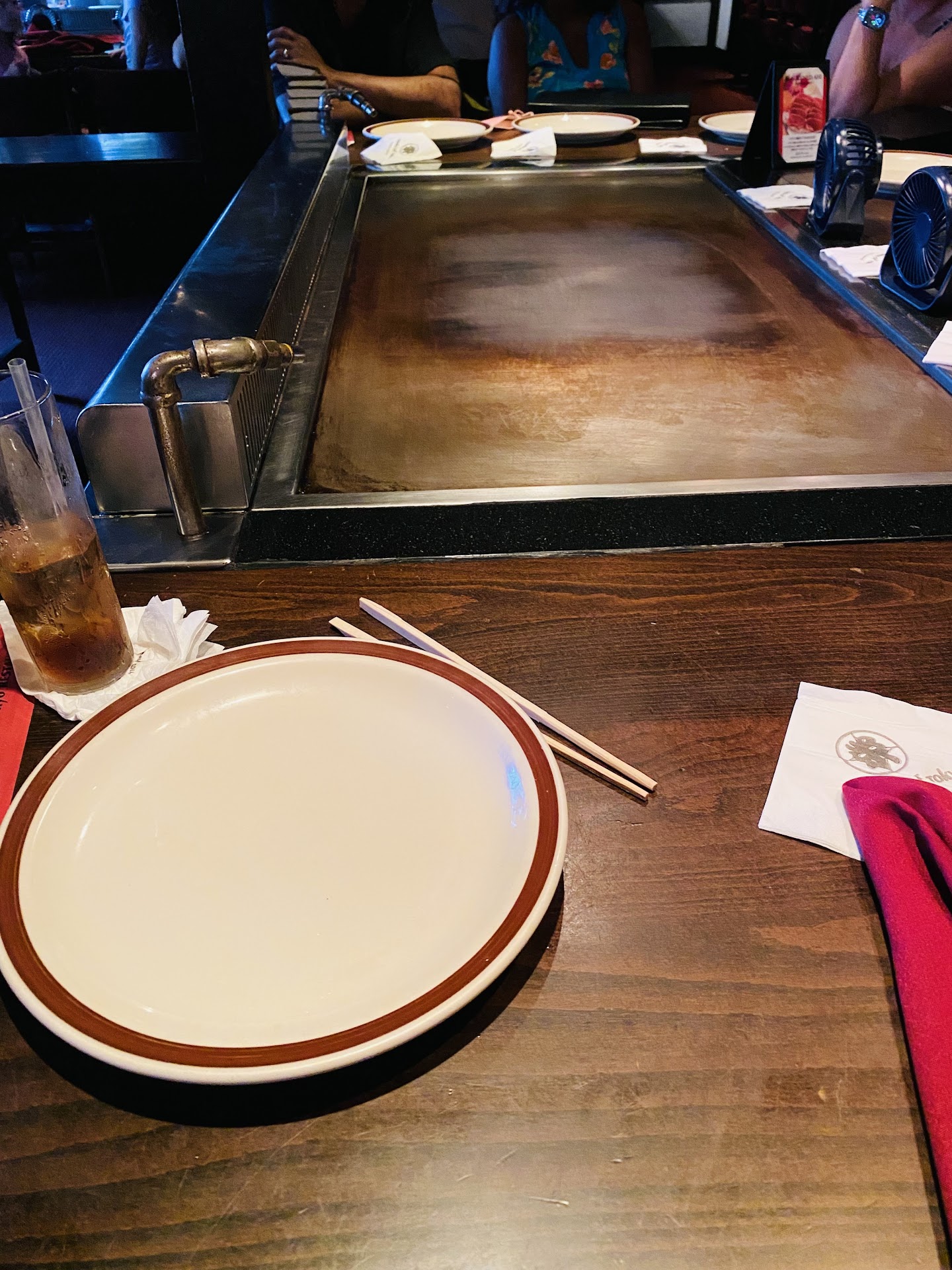I asked to speak with the manager and told him how bad the ventilation was, he said he'd check on it. Later he came to my table and said he agreed the smoke was had, "but everything is turned on". Other people at our table also complained, but the managers refused to do anything...no opportunity for another table, to take our food to a different part of the restaurant, no offer to compensate. We actually asked to pack up the rest of our food to eat in the hotel bc I couldn't sit in thee any longer...after waiting around 5 to 10 min to get a box to pack everything up, they told us they didn't have any utensils to provide us! By the time my husband was able to pay, our ice cream to go was half melted and they had no spoons to give us. We walked to the ABC store and had to buy a pack of spoons so our daughter could finish what was left of the ice cream.
