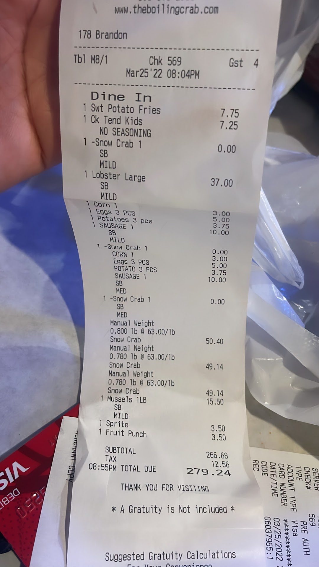 Read moreWe are here from Georgia and have never spent this much money on seafood before and The Juicy Crab in Atlanta is way better and a much bigger franchise. 50 bucks for one cluster of snow crab and it does not include any sausage, potato, corn eggs or etc. you have to pay additional for add ons. For what you get at this restaurant…it’s way too expensive. The portions are small! So it’s definitely not worth the money you will spend. You’re basically paying for their shipping cost to receive seafood from the mainland.