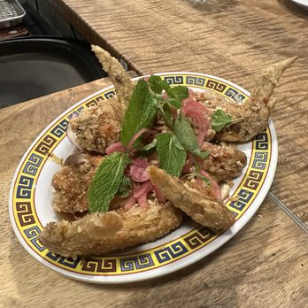 Chicken wings (makrut leaves, pickled red onion, peanut, money sauce): These are big, whole wings. The sauce was too thin for the meat to pick up on, so I kept having to dip the meat back on the plate. However the dish itself was crispy and the flavors were fresh.