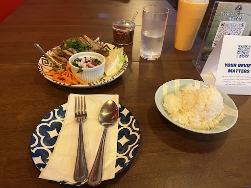 Read moreGreeted and seated right away. Note: watch step while entering, there's a raised green area and you need to step down. The server was very kind and friendly. I liked how the restaurant had traditional decor, fish and handmade items. They have big tables and an outside seating area too. The food came out pretty quickly and was good. We ordered the chicken larb and green curry with tofu. The larb was good and was served with cabbage, cucumber and green beans but I'm used to it having more mint or basil. The green curry was spicy for me but was flavorful! I want to come back to try the pho options because for $9.99 it spins like a good deal! They have a small parking lot to the side of the restaurant. They also support other businesses inside, which I...