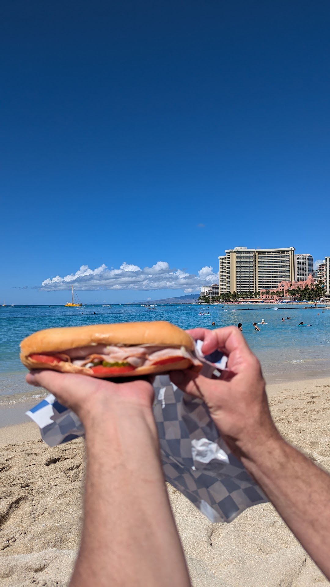 We got in around 10 this morning and the place was pretty empty. We were greeted right away by several employees and they were super patient with us while we decided on our sandwiches. As soon as we ordered each sandwich the cashier relayed it to the long line of workers who added components to the sandwich as it was passed down the line. After it was wrapped up they launched it with a delicate throw back to the front of the line behind the register--truly an impressive show of teamwork and efficiency. The food was delicious. It had the right amount of meat for our tweenager and our kid but I think next time my husband and I will opt to pay for extra meat. I have to say this is the best sandwich we've had on the island. We're from the mainland and we weren't used to such limited options in sandwiches but this compares to a few places we frequented back then. We liked how tasty the bread was though I have to mention my sandwich made me miss a dutch crunch loaf a bit. We could taste how fresh the rest of the ingredients are in the sandwich. My husband wished there was an option to add jalapenos but that's more preference than anything. Overall it was a really good meal that my entire family thoroughly enjoyed. Highly recommend coming here for your...