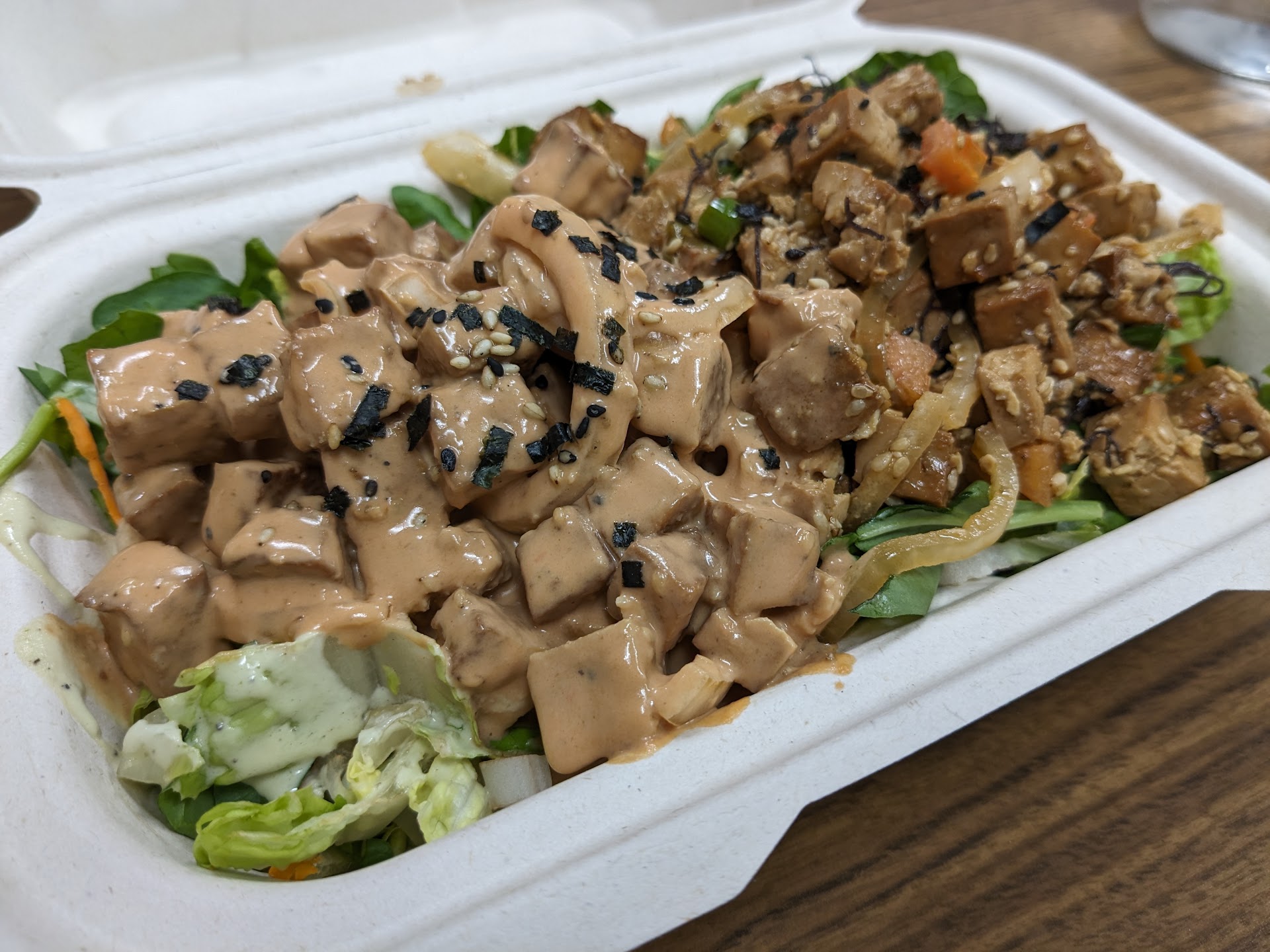 I recently discovered this place, and it has become one of my favorite places to grab lunch. I am not on a vegetarian diet, but I am trying to eat a more plant-based diet. So far everything I have ordered here has been quite tasty and the portion size is reasonable for the price. The servers have always been friendly, and the place looks clean. Today was the second time trying their tofu poke "bowl" special. I opted to get the poke with all greens, and I like that the "bowl" came with two varieties of tofu poke: limu and spicy. Both were good, but I liked the limu better. The spicy poke was good, but there was a bit too much sauce, which made it a bit salty, and it was not spicy at all. I would definitely get it again, when it is available. Looking forward to trying all the...