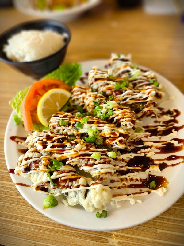 Whoa, my plate contained six ahi tempura and a slice of tomato and a leaf of lettuce and a bowl of (very good) rice. The tempura was drizzled with mayonnaise and teriyaki sauce and topped with chopped green onion. The Goya contained large pieces of pork and tofu along with slices of bitter melon with egg mixed in the stir fry. Itâs a quintessential Okinawan dish. My ahi was delicious, and I had difficulty in trying to finish my plate.