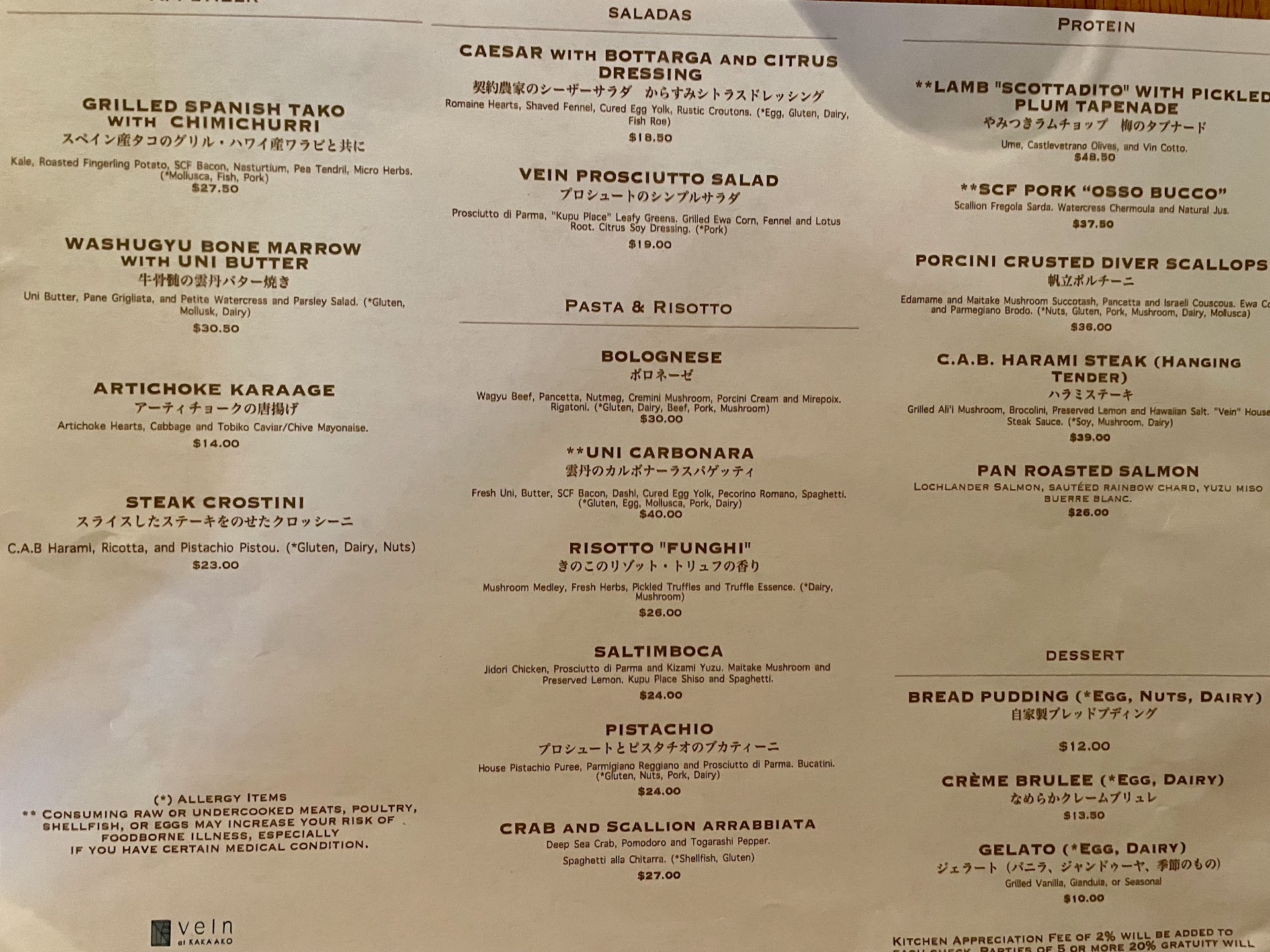All in all, we enjoyed our meal at Vein. Andrew, our server, was attentive but unobtrusive and we were given an 18% discount on the two pasta dishes. Thank you, Andrew! We gave Vein a 4-star rating and Iāll grant it a ā+ā for reasonable the cost...