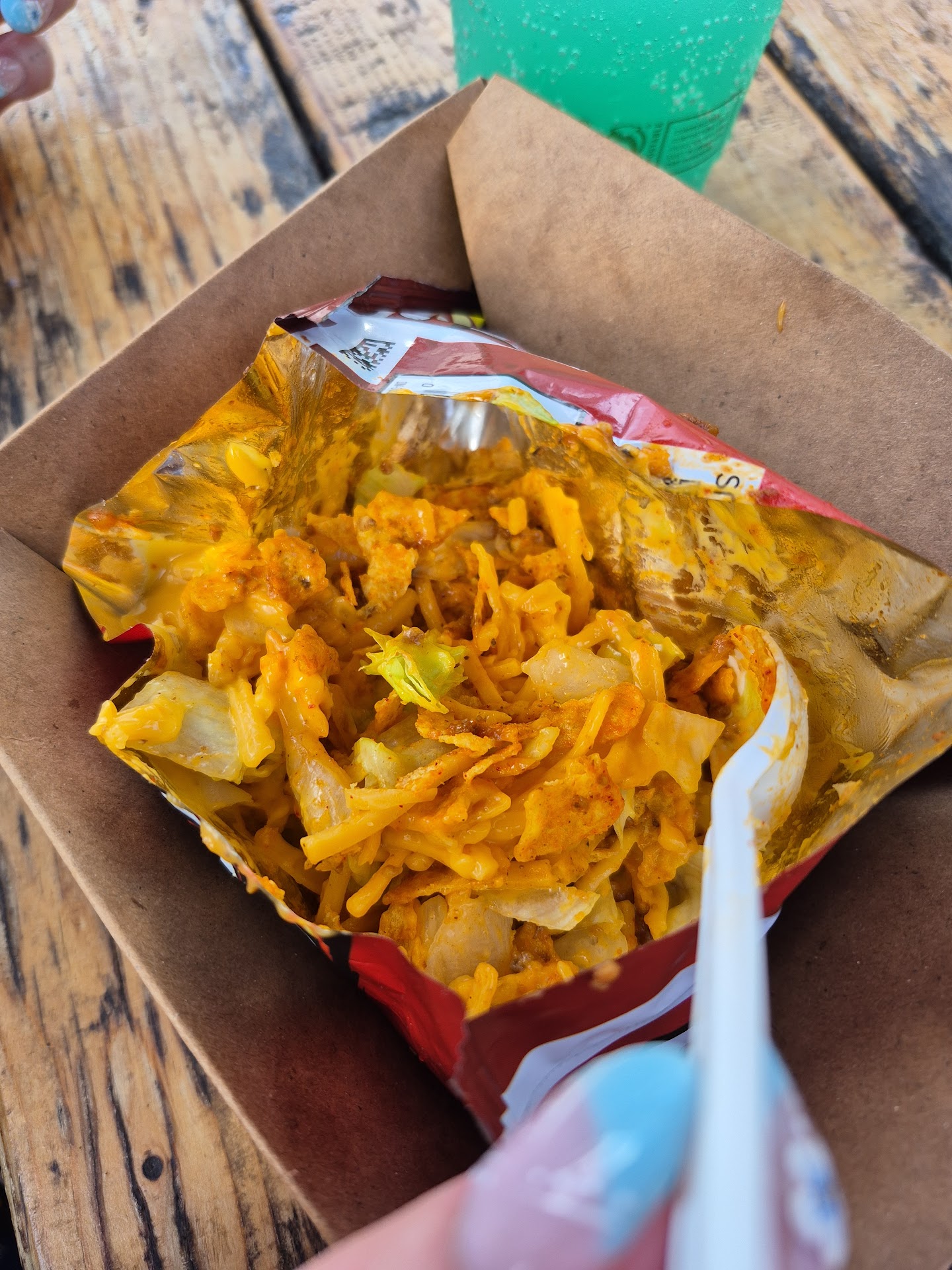 I don’t normally give this bad a review, but I felt some need to balance all the great ones after my experience here. I should have read the good reviews more closely, because if I had, I would’ve realised when I got there that the employee at the stand was not the amazing friendly employee in so many of the reviews. The guy who helped me was rude, acting like I was stupid when I asked what a walking taco was. His general attitude the whole time was that I was just an annoyance he had to deal with. We asked for guacamole on our burritos, and were charged for it, but there wasn’t any on them. The burritos were very low quality, and 90% rice. Very bland. As he was putting salsa in a cup for us, I mentioned happily how much I loved salsa, thinking he might fill the cup, but he left it maybe 2/3 full. The walking tacos themselves were better than the burrito, but still pretty average. I don’t know for sure if this was related, but within a few hours of eating there, my son was throwing up ( 3 times over 8 hours - after which he was fine ). Definitely...