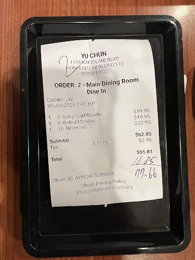 We were vacationing in Oahu, and one person in our group just had to get some Korean food, so we stopped by here. We got 4 different dishes at this place: naengmyun (cold noodles), fried rice in black bowl, kalbi, and tteokbokki (rice cakes in hot sauce). The cold noodles were decent. No real complaints there. The fried rice were semi disappointing because it wasn't very hot (temperature). I understand that it wasn't a stone bowl fried rice, but I still expected the rice and other ingredients to be hotter than room temp. The kalbi was the most disappointing. The meat was tough and the flavors were just so-so. We've had much better kalbi at L&L. This is not a knock on L&L, but L&L is a fast food take out place, and you'd expect a much higher quality at a sit down Korean place where it costs twice as much. Finally the rice cakes were also disappointing. Not only did they not allow adding ramen noodles despite the menu indicating that we could (they said the menus were old), there were only like 10 pieces of rice cakes, and the flavor was mediocre.