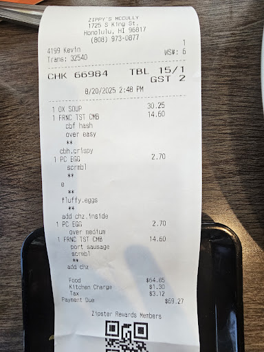 Food is good but the usher at night, an older Filipino man is extremely rude! I've seen him body shame people by telling them they have to wait longer cause "the booth that moves (to allow for bigger ppl to have more room between the seat and table), someone is sitting in it"!!! These ppl are normal size locals!!! And there is only 1 booth that does that, so if all the tables with chairs or if you ask for a booth is full he will make you wait and not allow you to sit anywhere else cause he thinks you are too fat to fit! Once We came twice in a months time and he made nasty comments as he was sitting us! Saying "no good come here, you'll get FATTER" Don't even bother getting food from the front! 5 workers standing around not wanting to help anyone, even if you ask for help they just stare at you like you're stupid for bothering them and how dare you for walking up and asking for help. They will stare at you and walk away without saying a word! This happens whenever we go and we have seen ppl yell at them for help, they really don't care... While waiting for food once we watched a female worker have a full convo with her boyfriend on the phone for 30mins, cracking up so loud in front of everyone. I walked over and asked for help she looked at me and told me she's taking a phone order! Plus the food they give you for take out is so little bit!!! Compared to the other Zippys. It's just better to dine in BUT get the male servers though, the females always somehow vanish during their shifts and don't return until they hand you the check! The male servers have to pick up their slack! As for the bakery... This Zippys specializes in making mini Donuts and charging you full price!!! They are a quarter of the size then every other Zippys but they charge you normal price!!! I was so shocked when I saw a Danish donut 1 inch long an inch wide for $2.15!!! How are they allowed to get away...