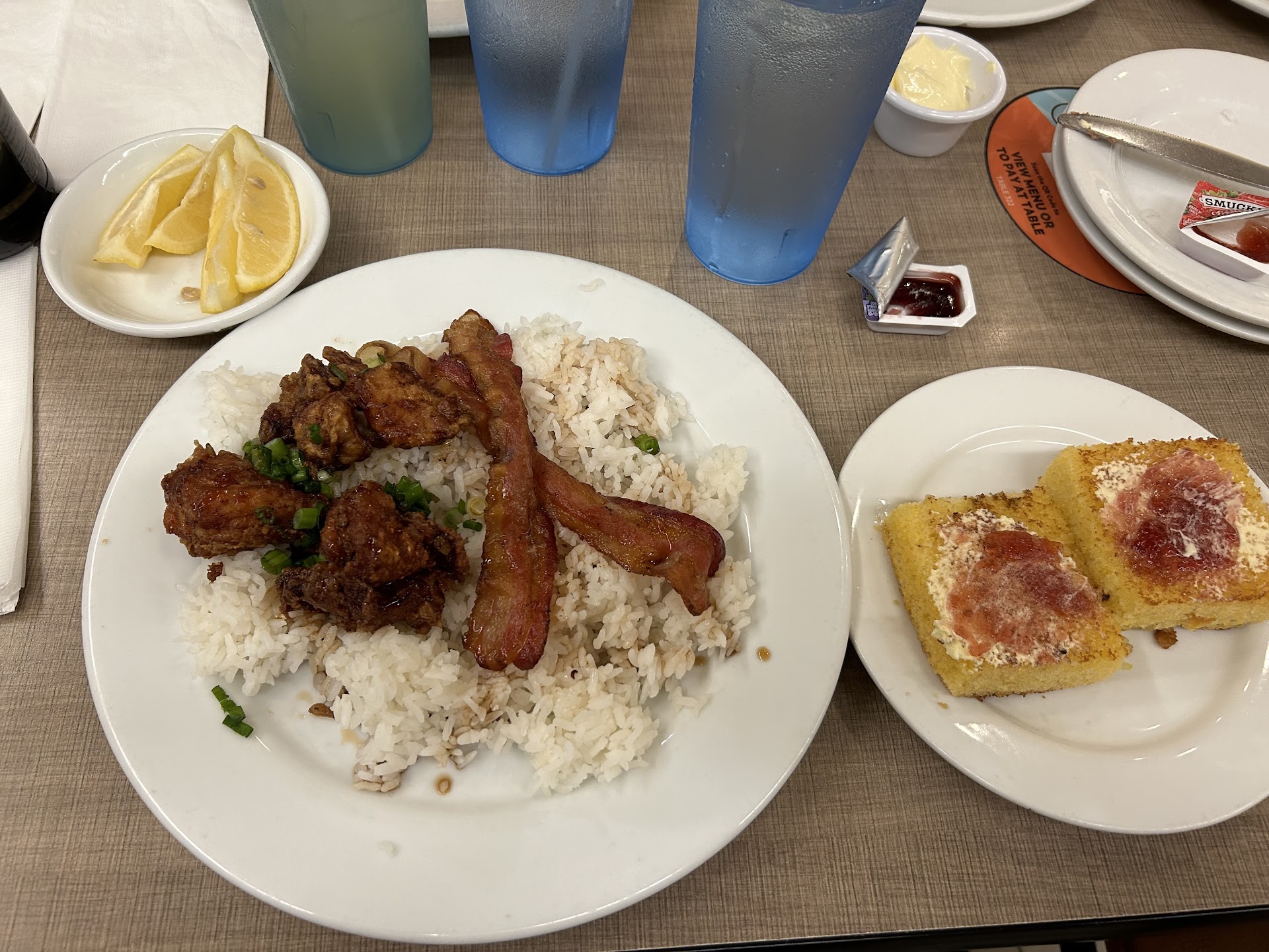 I ordered grilled cornbread as well & It tasted like it was sitting out for a long time. It tasted very dry and cold. The thing is I love Zippys but overall the food did not taste hot and fresh and for the increase of pricing, I paid $15.00 for this plate and it only came with three tiny pieces of chicken and two pieces of bacon. The service was okay.