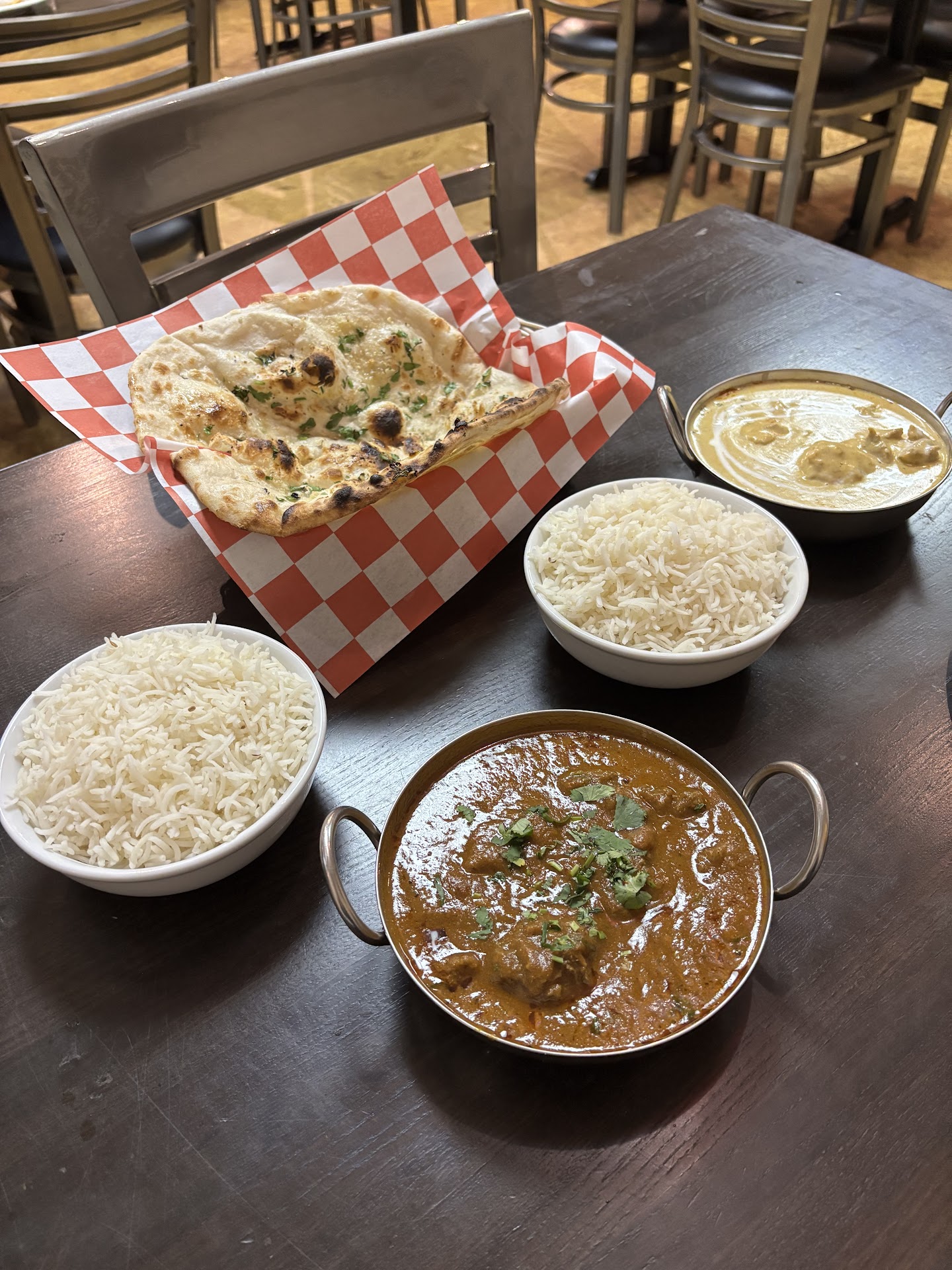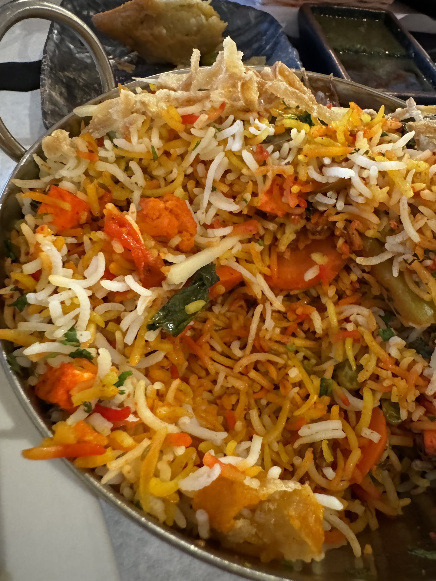 First time coming here I had the chicken Biryani which I didn't care for the rice is too overwhelming on different spices for me personally but the chicken I loved. Now others rave about the chicken Biryani though. This was my first time trying this dish. I really loved the garlic cheesy naan and the spinach cheese naan though! Was the best naan we ever had. Reminded me of a quesadilla. I forget what my husband got was something like chicken GOA? I could be wrong on the name. It was very tasty in my opinion but it wasn't my husband's favorite he liked it okay though. My step son's girlfriend got a chicken curry that I sampled and I liked it so did she. We all shared 2 rice pudding desserts(I forget what it was called. The rice pudding was okay but wasn't a big fan personally I think it has anise in it? Or something that tastes similar to black licorice and I don't care for licorice so just my taste buds Our step son's girlfriend loved it though! She devoured the whole bowl.