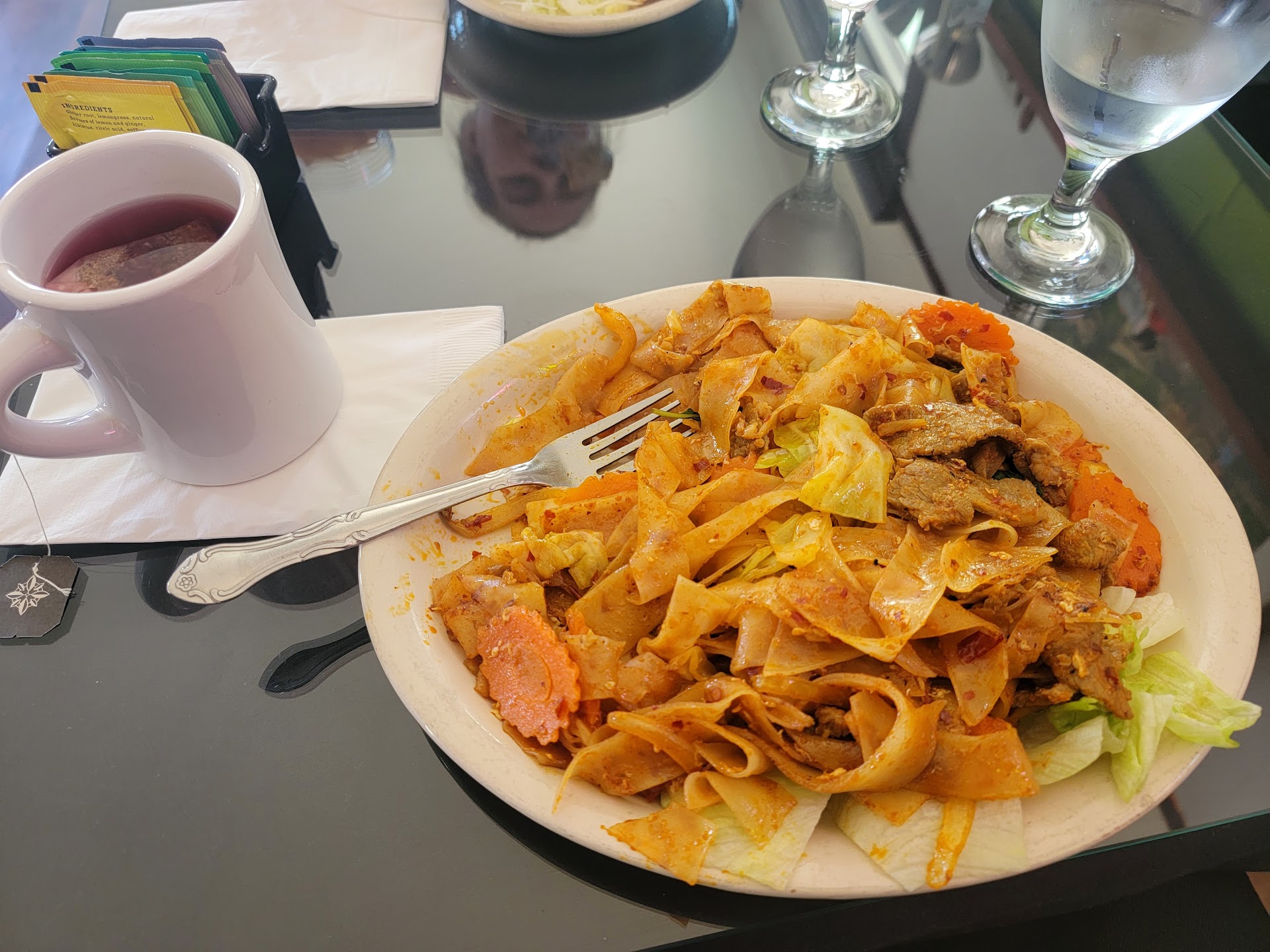 Onto drinks. They had no soda available, which was written over the menu in sharpie, no change or update to what they offer officially, just scratched out and written not available. The 'hot tea' which you normally order at a thai place did not come when I ordered it. Instead what came was a cup of hot water, and a bunch of assorted tea bags, expecting me to steep my own like I'm in an elderly diner from the 90s. Their thai iced tea was primarily milk and sugar, and had a very underwhelming use of spice.
