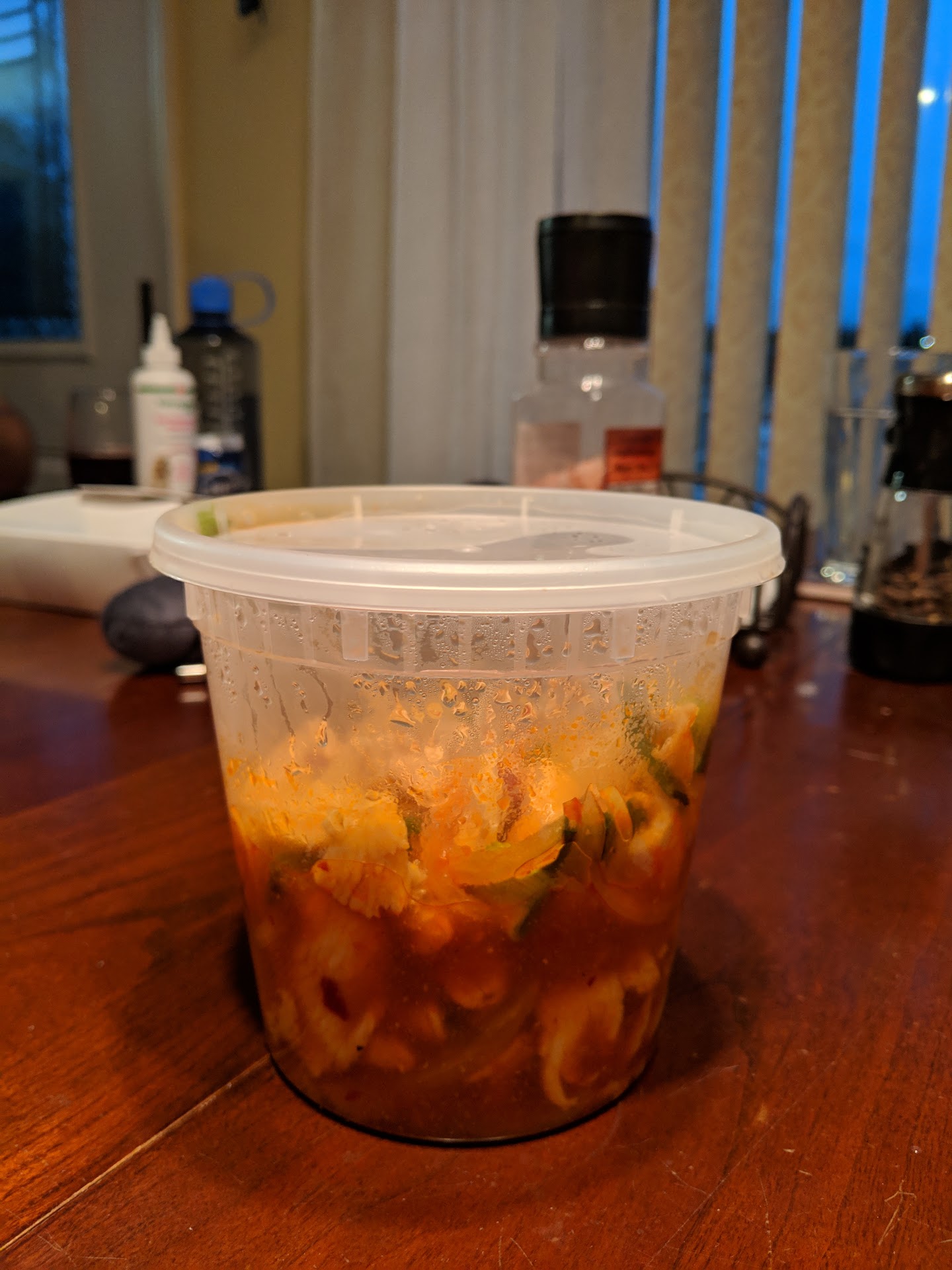 Onto drinks. They had no soda available, which was written over the menu in sharpie, no change or update to what they offer officially, just scratched out and written not available. The 'hot tea' which you normally order at a thai place did not come when I ordered it. Instead what came was a cup of hot water, and a bunch of assorted tea bags, expecting me to steep my own like I'm in an elderly diner from the 90s. Their thai iced tea was primarily milk and sugar, and had a very underwhelming use of spice.