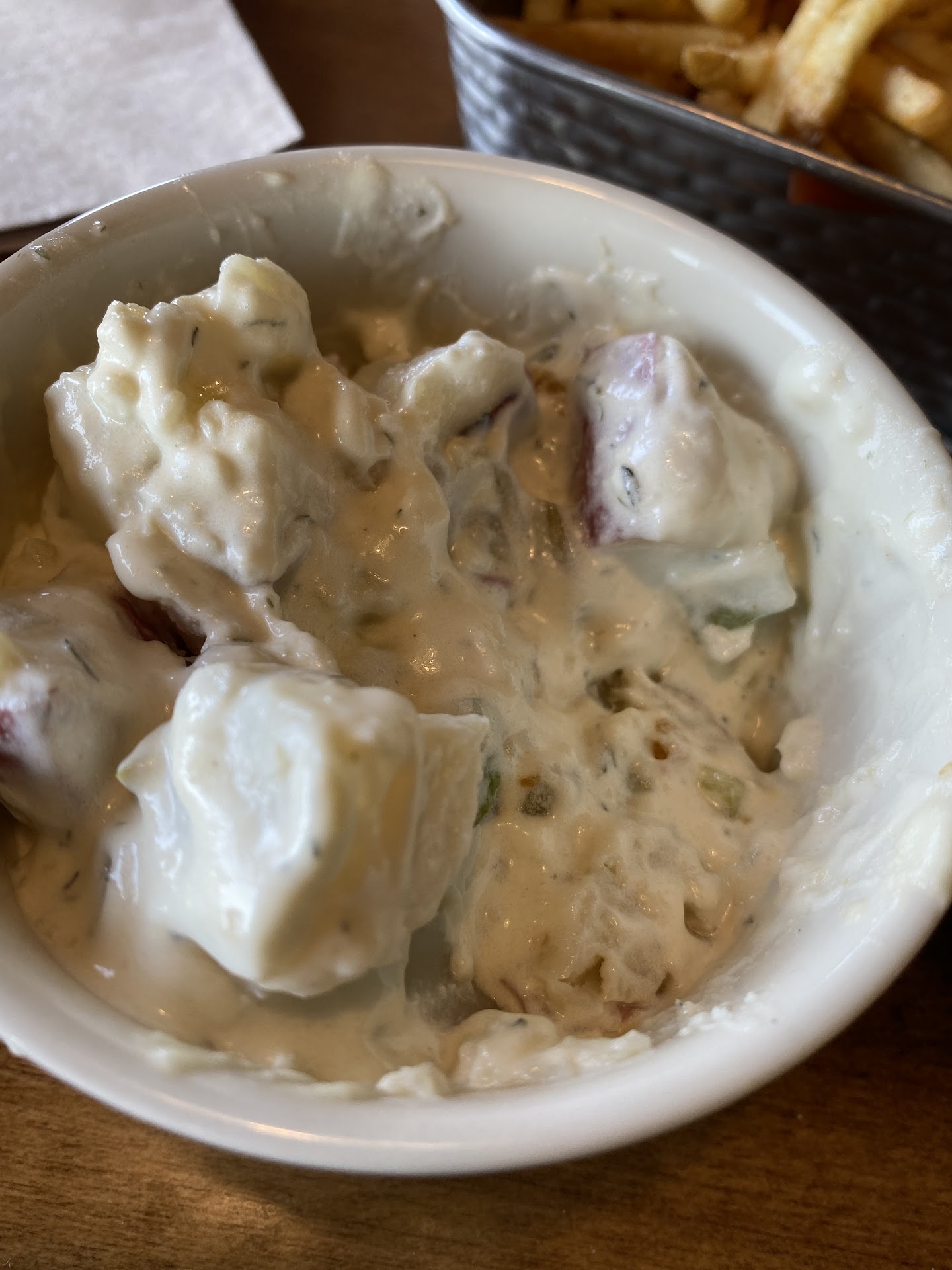 The potato salad was smothered in mayonnaise with a hint of dill seasoning. The flavor is good, but itâs not something I would order again.