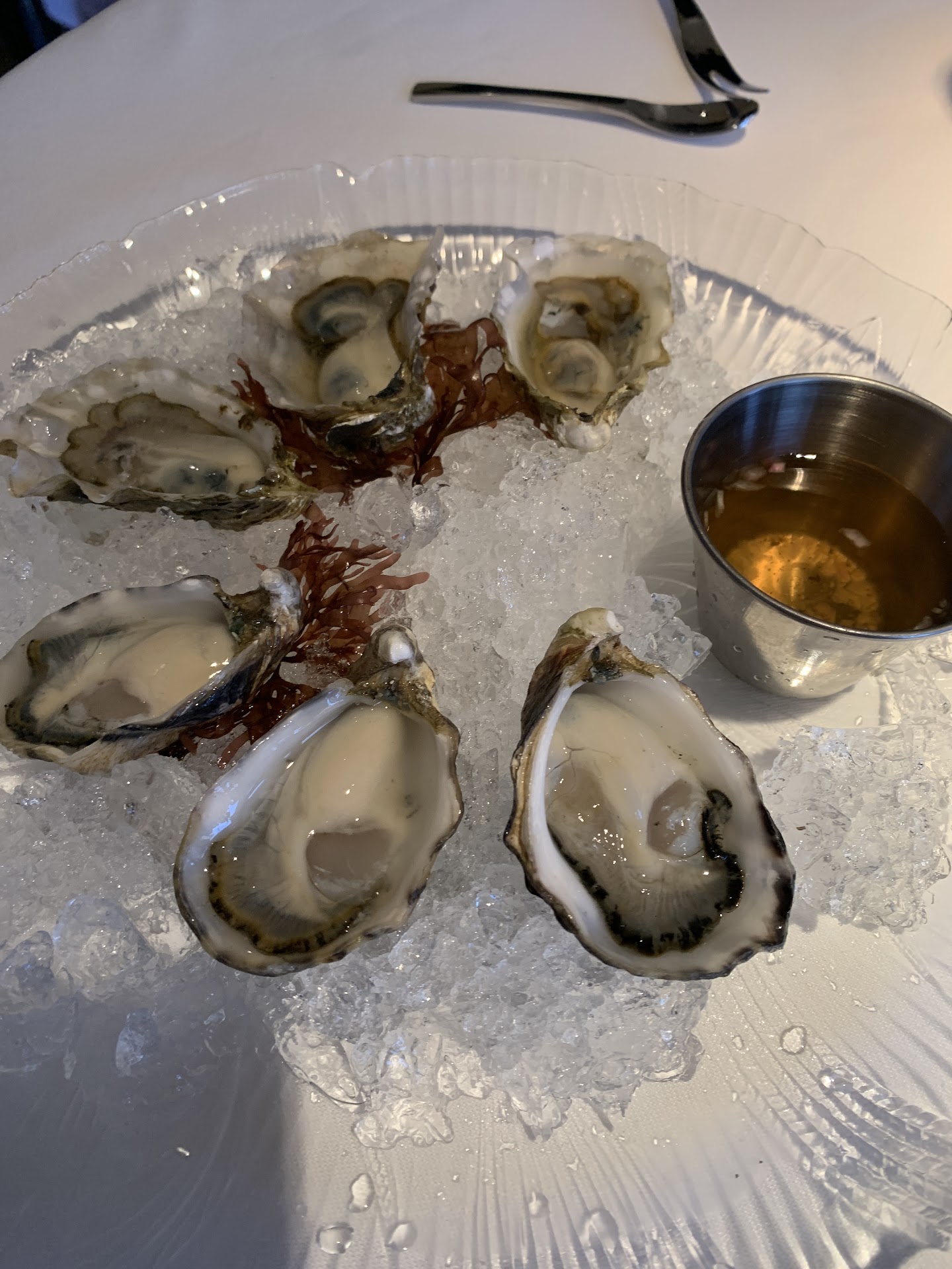 My dining companion chose oysters as a starter($25 for what the menu said were "Virginica" oysters). We were told about the oysters being served that night, selected the "Virginica," but the second server who delivered the dish told us that we were getting 3 of one kind and 3 "Baywater sweets." Not wanting to waste the dish, we left it ... but were confused over whether this was a snafu due to lack of communication among the 2 servers or a kitchen decision.