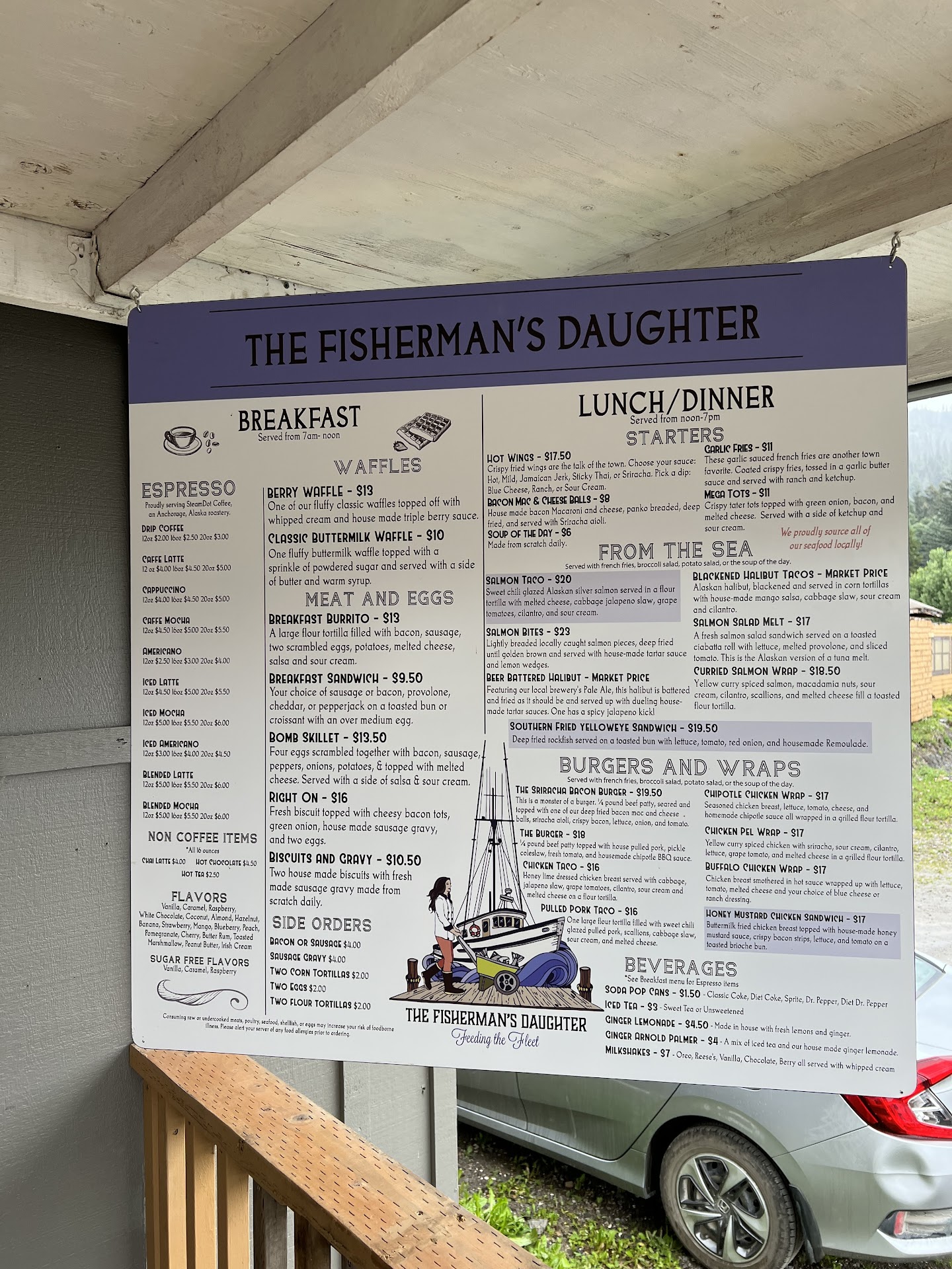 Fantastic little spot off the beaten path in Hoonah for breakfast, lunch, & coffees. The food was great & the staff was really friendly. If you're looking for a local spot with a fantastic menu selection, this is a place the fits that perfectly. We enjoyed the biscuits and gravy. The biscuits tasted like grandmas, and the gravy was absolutely delicious. Lots of sausage. We also had the breakfast burrito. It was very filling and a great combination with the cheese melted perfectly. On the lunch menu, the beer, battered halibut was definitely a win. The breading was light and perfect. You could definitely tell the fish was fresh, not like something you would get at a restaurant in the lower 48. The blackened halibut tacos were a win as well. The combination of slaw, salsa and halibut was great. There was honestly nothing we tried on the menu during our stay in Hoonah that we didn't like. If you've ever watched the show "deadliest catch," this feels like a meal the fisherman would eat on board one of the ships. One of the other cool things about the spot is people who are working for the US Department of the interior on roads, etc. in the area were eating here as well. They were able to give some insight on where to find bears in the area and some local sightseeing spots that were off the beaten path. The fisherman's daughters is such a cool place. I...