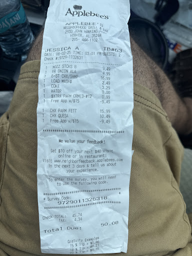 Ā Ā Ā Read moreApril 9th incident. I didn't need to write this out of anger and disgust: I really wish that I had something good to share. I will make an attempt. The parking was great. Easy access in and out. I ordered food to go for our family if five. It was my husband's birthday. I went in and waited for someone to greet me. A gentleman was going in different areas so I knew patience and understanding was needed. After a few staff looked at me, the gentleman who had grabbed a broom earlier was the one who greeted me. I shared why I was inside (when ordering online I was given a choice to pickup inside). I was looked at with a look of confusion and sent to the baršš³. I was told to let the lady at the bar know why I was there. I made it to the bar and saw the lady who went pass me and pass me again and finally, she looked irritated and asked, "May I help you." I told her that the gentleman sent me to her so that I could pick up my order. She looked upset and just walked away. She eventually spoke to the guy and had him to check on my order. I waited and waited and waited. Another gentleman came out from the back and handed me my order. I checked it and was missing a meal. I made the lady aware. She went on to another customer. I was ticked at that point. Eventually she said, "I will check on it." The guy came back out and thought he had given it to me. I spread everything out and yes, I was correct. I waited again longer. I had no utensils and asked the rude lady hosting the bar if she had any. She brushed me off with a no. I said, "Well, I need some." She threw her cloth on the counter to go get some. It was not busy at all. I didn't want to fuss on my husband's birthday. We made it home and the food was not good. Not much flavor at all. My daughter said that she has had better chicken fingers from a fast food. Choose carefully if you plan to eat at this Applebee's. I forgot to slow down in order to contact their franchise owner. I even thought to myself, "Maybe they are all not being treated fairly on the job or something." Sad and...