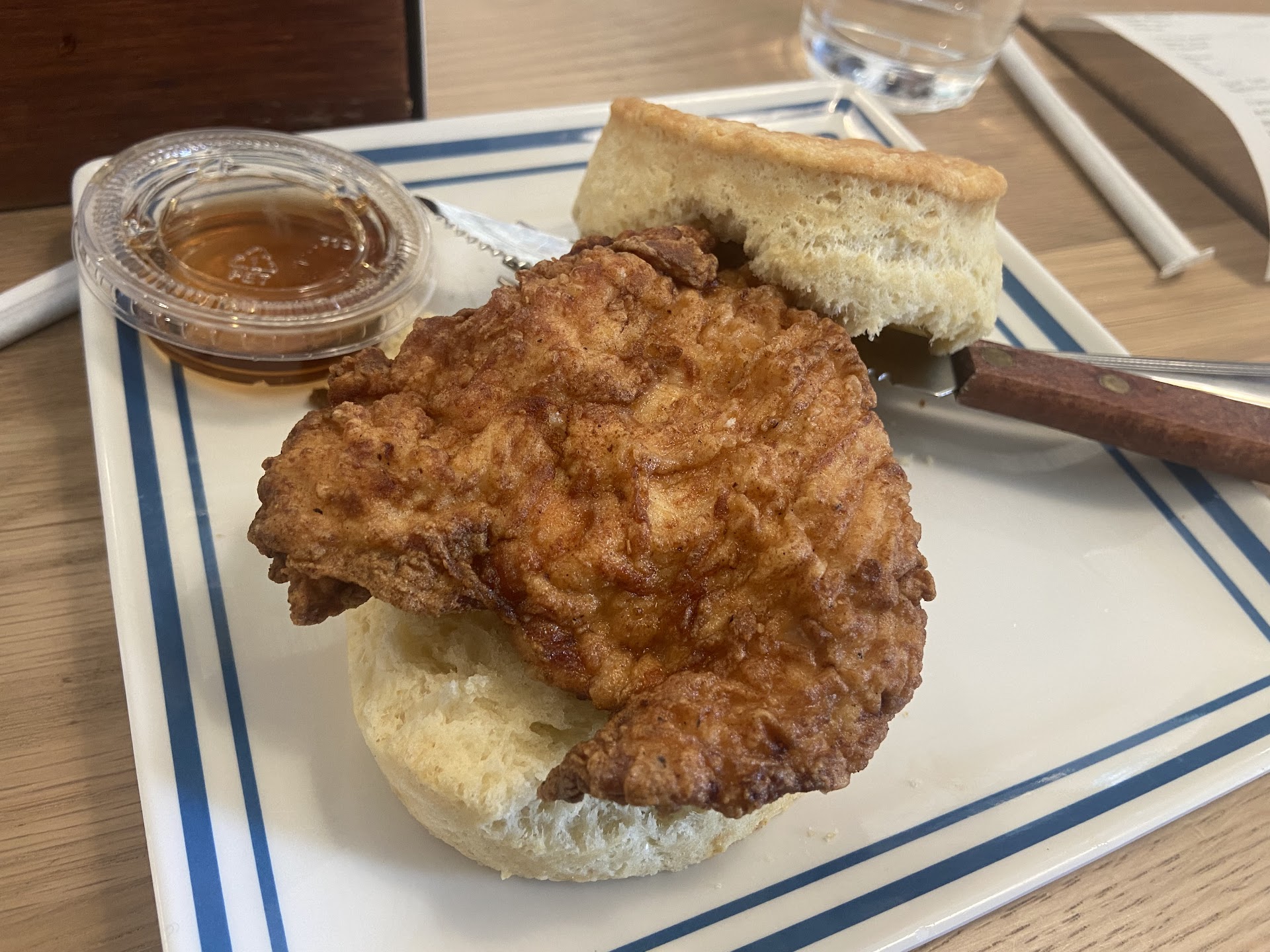 I ordered a Not Chicken and Waffle (I think that's what it was called) and basically it was a split biscuit cooked like French toast and those that know me know French toast is my favorite. I have a tier list it's French toast, waffles, then pancakes for me. Also those that know me know I don't care much for biscuits but these were good especially with the syrup on top. Now the chicken itself was nicely seasoned and I could tell they cooked it fresh. I could also tell they don't marinate their chicken which is fine but it's easily noticeable when chicken isn't marinated because you can taste it's pure white chicken breast. As I said before it was good and crunchy and still seasoned well. I liked it. I give the meal an 8/10.