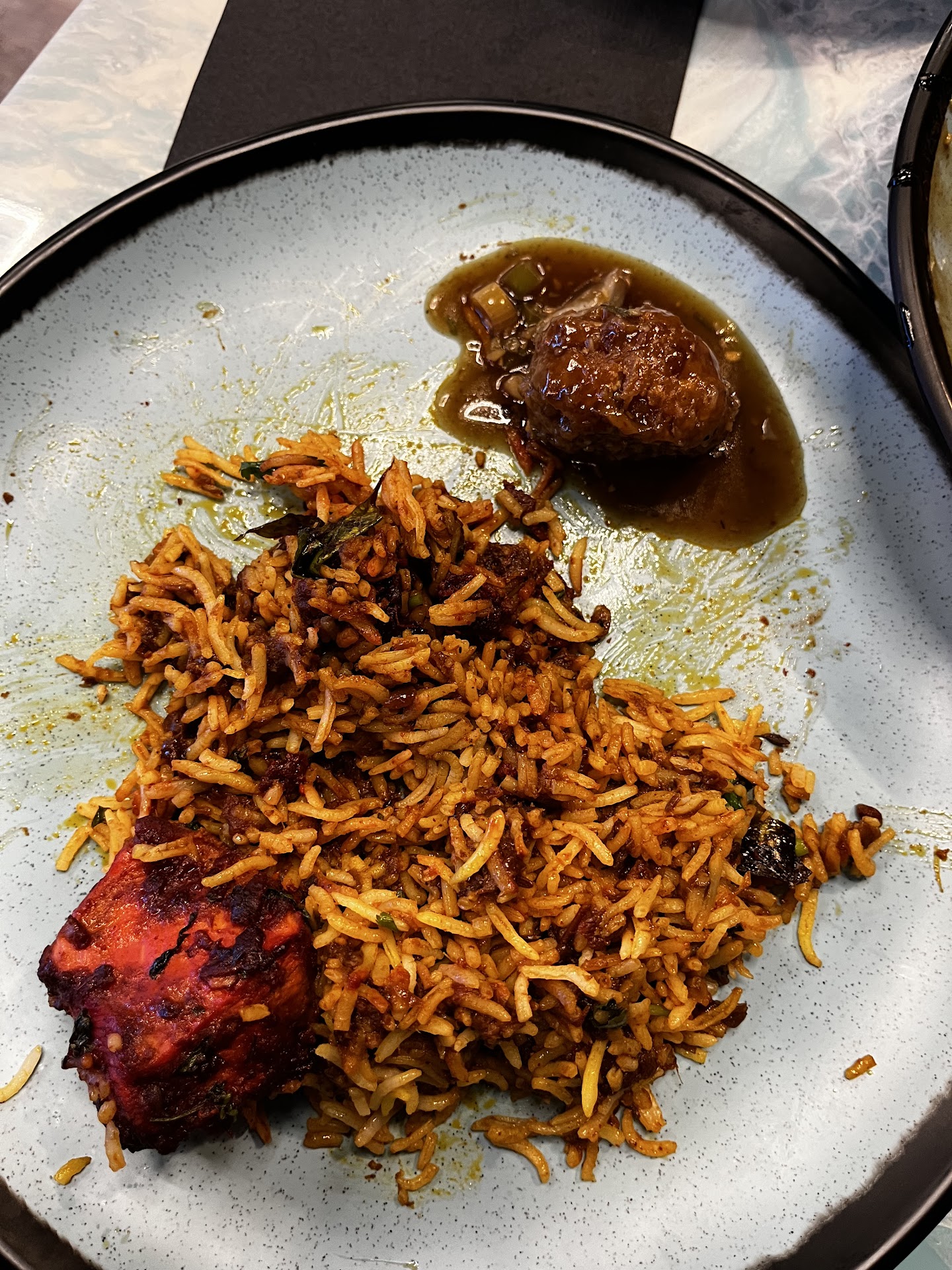 Gongura Biryani & Baby Corn Biryani â Both had excellent flavors and unique spice profiles.