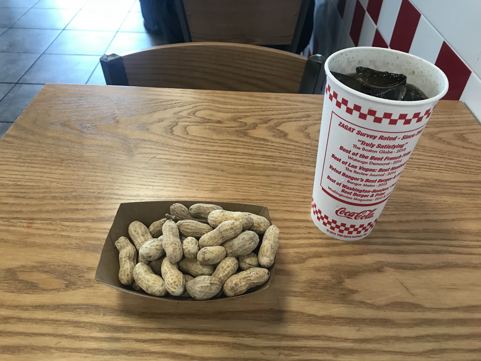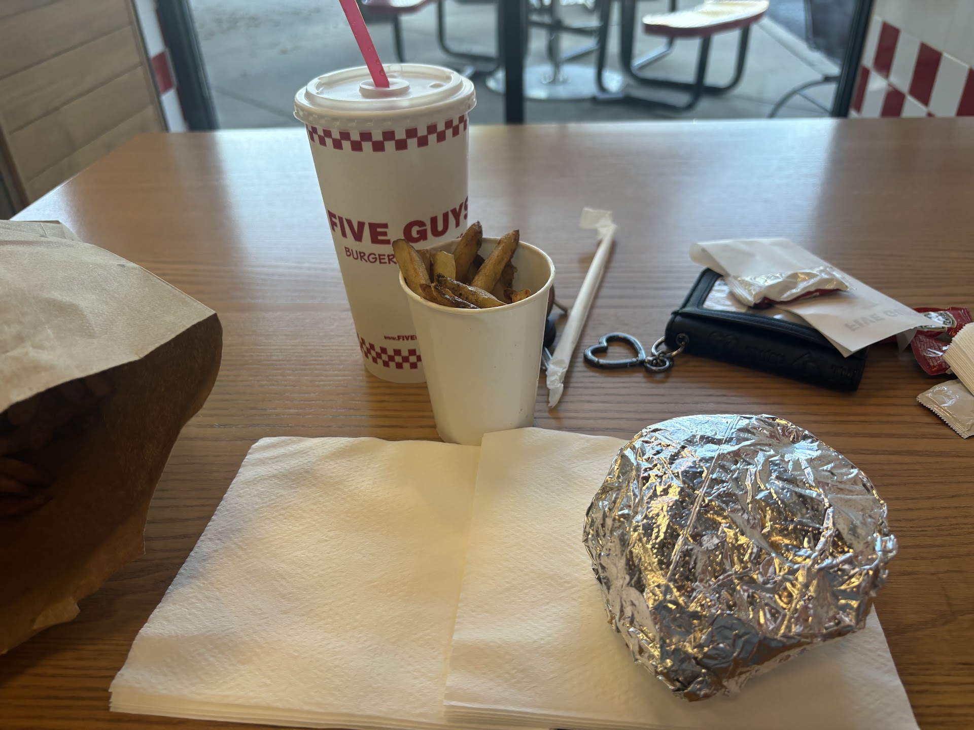 Read moreWasn't that impressed with my first visit at this location and the first time in a few years at any five guys location. I wanted to see if their burger was really really better than the usual 3 dollar burgers you get at the other chain restaurants. Restaurant looked clean on the inside but no TV to watch that you would normally see at newer restaurants and there was no free wifi for patrons that I could find on my tablet. The burger had two patties which for 10 dollars to be honest with ya I would have preferred 3 patties for that price. Meat was a little dry tasting. The little fries I bought was their first tier fry and it was over 5 dollars for fries with no seasoning in a small paper cup that wasn't worth the price in taste or the amount given. I didn't buy a drink I brought water in and I'm glad I did cause just these two items were over 16 dollars in price. The interior music was little too loud for my taste..overall I want be eating at a...