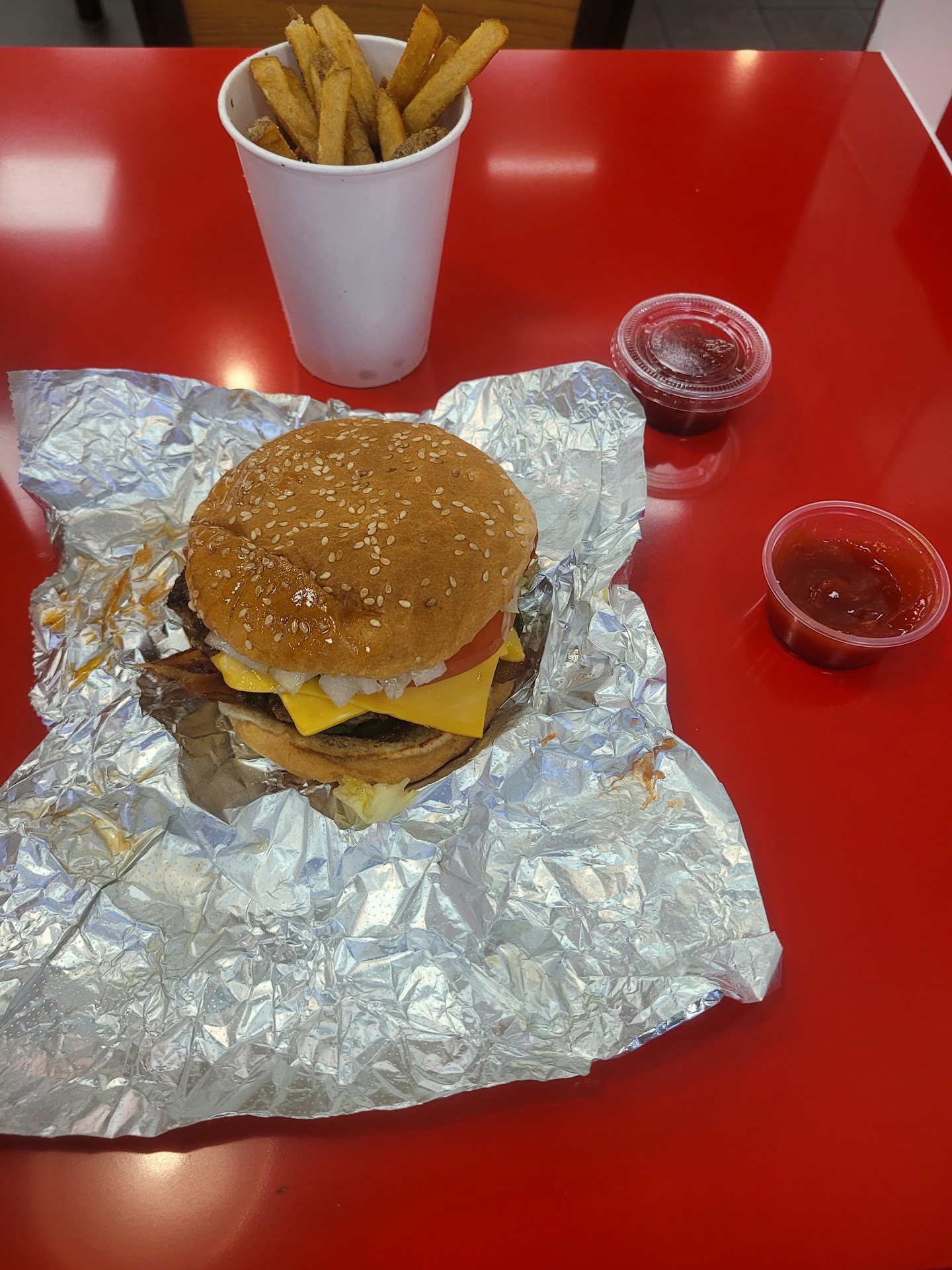 Read moreThis must be AL's broke down version of a Five Guys. Used to go to them all the time in MD closer to their VA origins and it was always pretty stellar. Everything I got was doused in grease and tasted like onions. Even the milkshake tasted like onions. I couldn't even conceive how that happens. Also, the grilled onions and jalapenos were just the actual veggies plopped onto the burger. They hadn't been grilled, were basically raw, and were flavorless. That's the irony. Everything tasted like it was smeared in onions, yet the onions were devoid of flavor. How is that even possible?