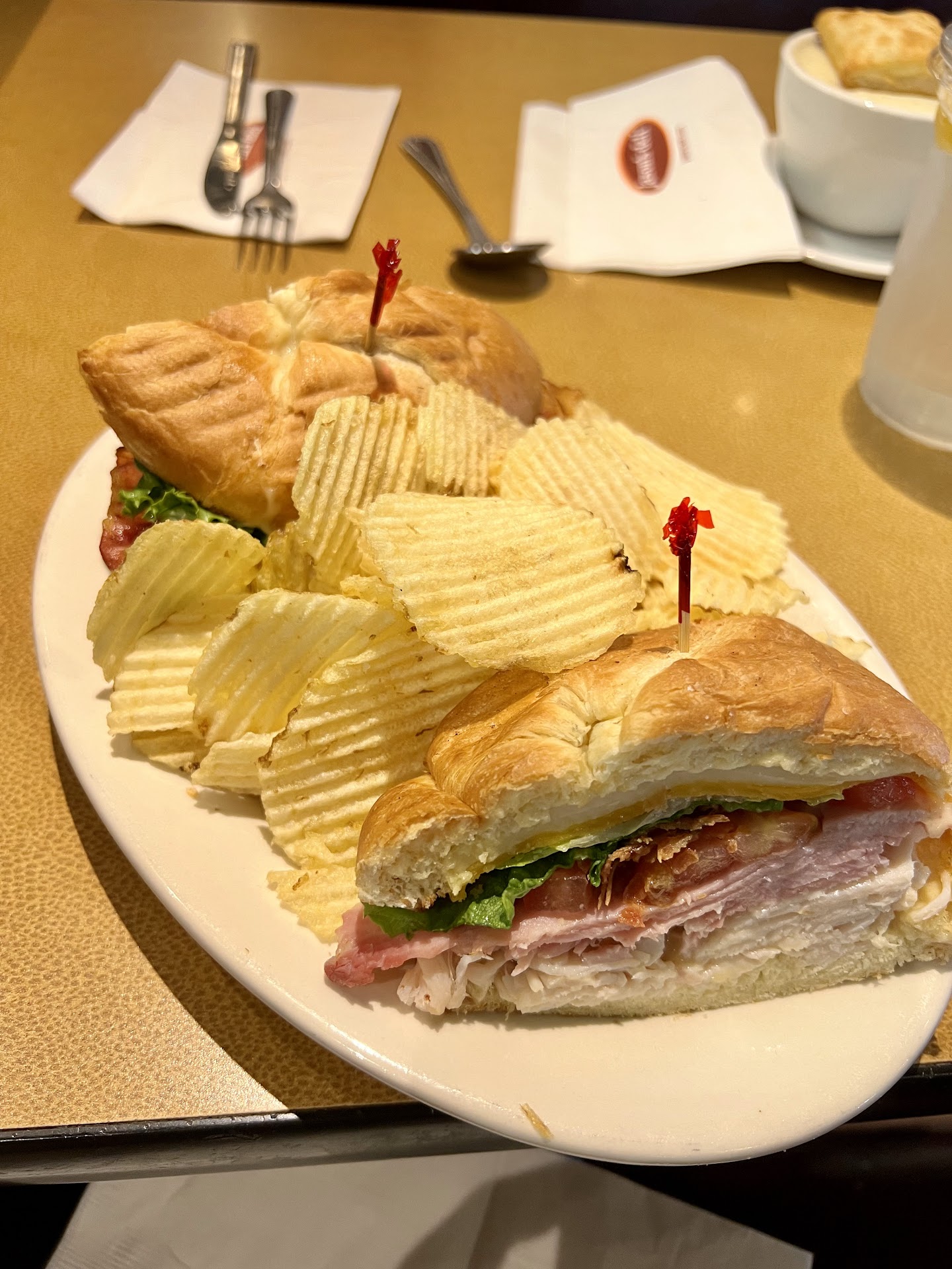 While looking over the menu, I got a call from my son, who has a severe peanut and pecan allergy and avoids all nuts for safety. He asked me to order a chicken panini, which comes with a basil pesto aioli. Being in the industry, I know pestos are sometimes made with pinenuts, sometimes not — so I simply asked the manager if their pesto contained any.