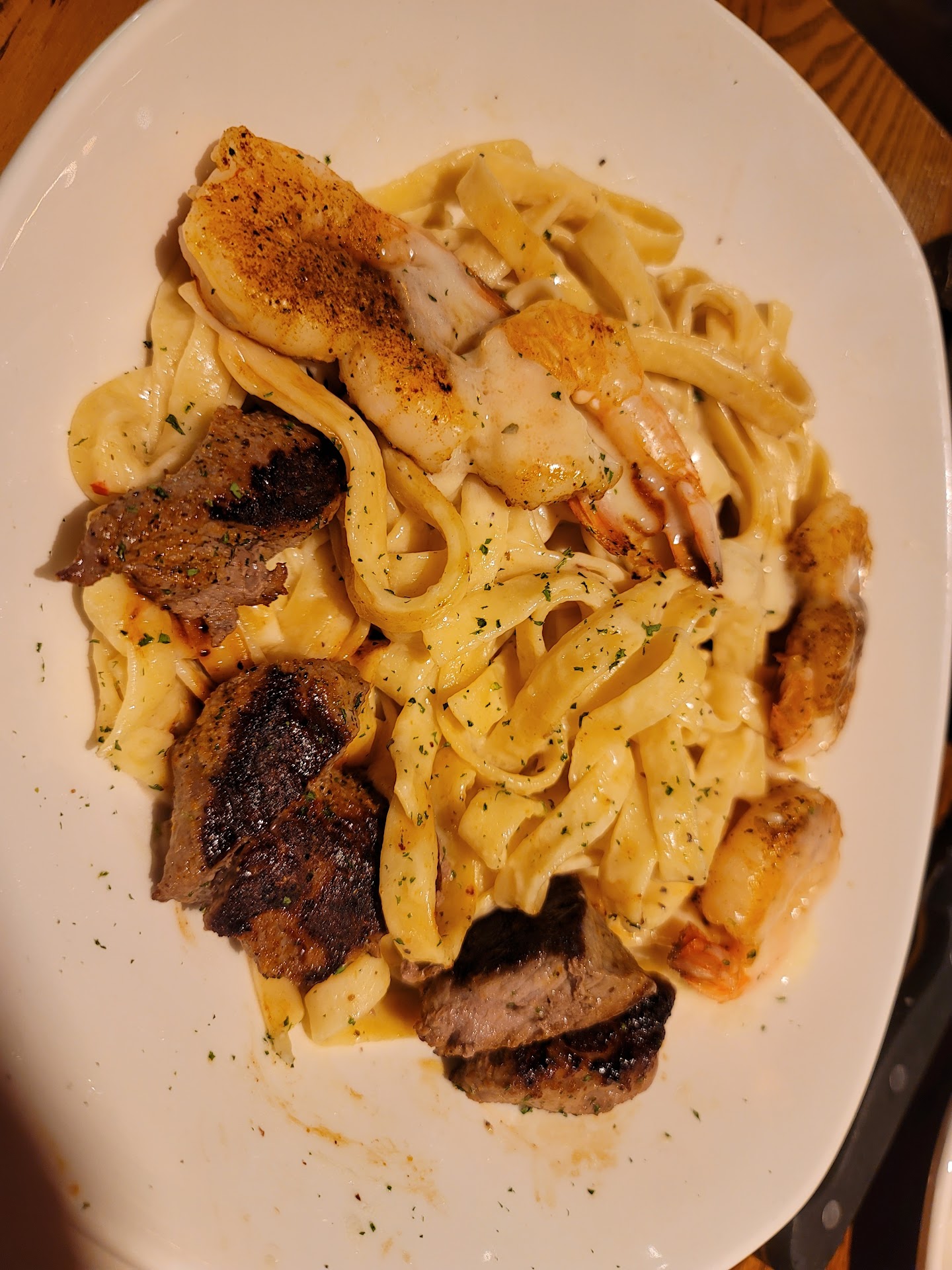 Read morethis company has really gone downhill. i came with my partner to eat for my birthday on thursday the 19th, and was very underwhelmed and disappointed. our server was very sweet and helpful. you could tell she's probably been working all day and dealing with horrible customers and management alike. but she was so in the weeds and without any sort of help from her teammates that we didn't see waters until fifteen minutes after we sat down. let me clarify, this review IS NOT about our server. she was great. the appetizers, mac bites and hot kookaburra wings, were delicious. the potato soup was a little salty for my taste, but my partner enjoyed it. i ordered a kingsland pasta with medium steak. the last time I had ever tried it, i got this beautifully plated pasta with warm, fresh grilled shrimp and perfectly medium steak on skewers, with a rich alfredo topped with i believe parsley. what i received last night was burned steak chunks and hard shrimp thrown on top of fettuccine, with a congealed sad excuse for alfredo sauce. i wanted to give it a shot, and took a few bites, but it just wasn't good. there were no issues taking the food off of the bill, and i was offered a replacement entree, but my appetite had been ruined at that point, so we politely declined. paid and left, most likely won't be returning. but my server, don't remember her name but she was the sweetest, with pale blonde hair and glasses. hope she moves on to bigger and better, because this restaurant is failing her and failing the clientele. even the guests around us seemed to hate their food and be having similar issues. such a shame. we won't be returning here, or probably ever to...