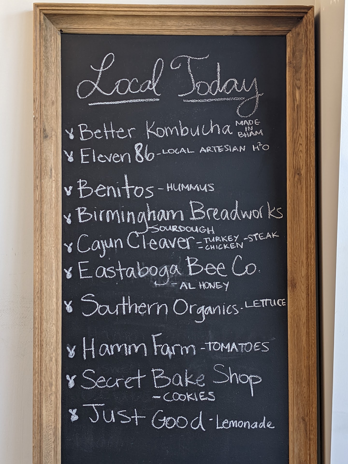 I like the chalkboard that specifies the local suppliers. I like the airy, clean interior, and I really enjoyed the friendliness of the staff. The veggi on sourdough was tasty, maybe the mushrooms had a tad too much vinegar, but overall a happy, full-flavored sandwich that I can recommend. The calories of the lunch are balanced with the needs of an office worker but will not sustain a person that does physical labor. Order here refers to a touch screen that lets you pick and choose from the menu, offers additions, and lets you fine tune your order. I like to have a person in front of me that I can ask for clarification or for some register banter. There was quite a wait at the order screen and for the food but I got there a few minutes after noon and probably hit their busiest time. The one star deduction is mostly due to the fact that they don't offer water and you have to buy $1.50 bottled (disposable) water. As a suggestion. I enjoyed the solid wooden board my sandwich was served on but the beauty of the board made the disposable plastic fork stand out like a sore thumb. If you can clean the boards, you can clean a...