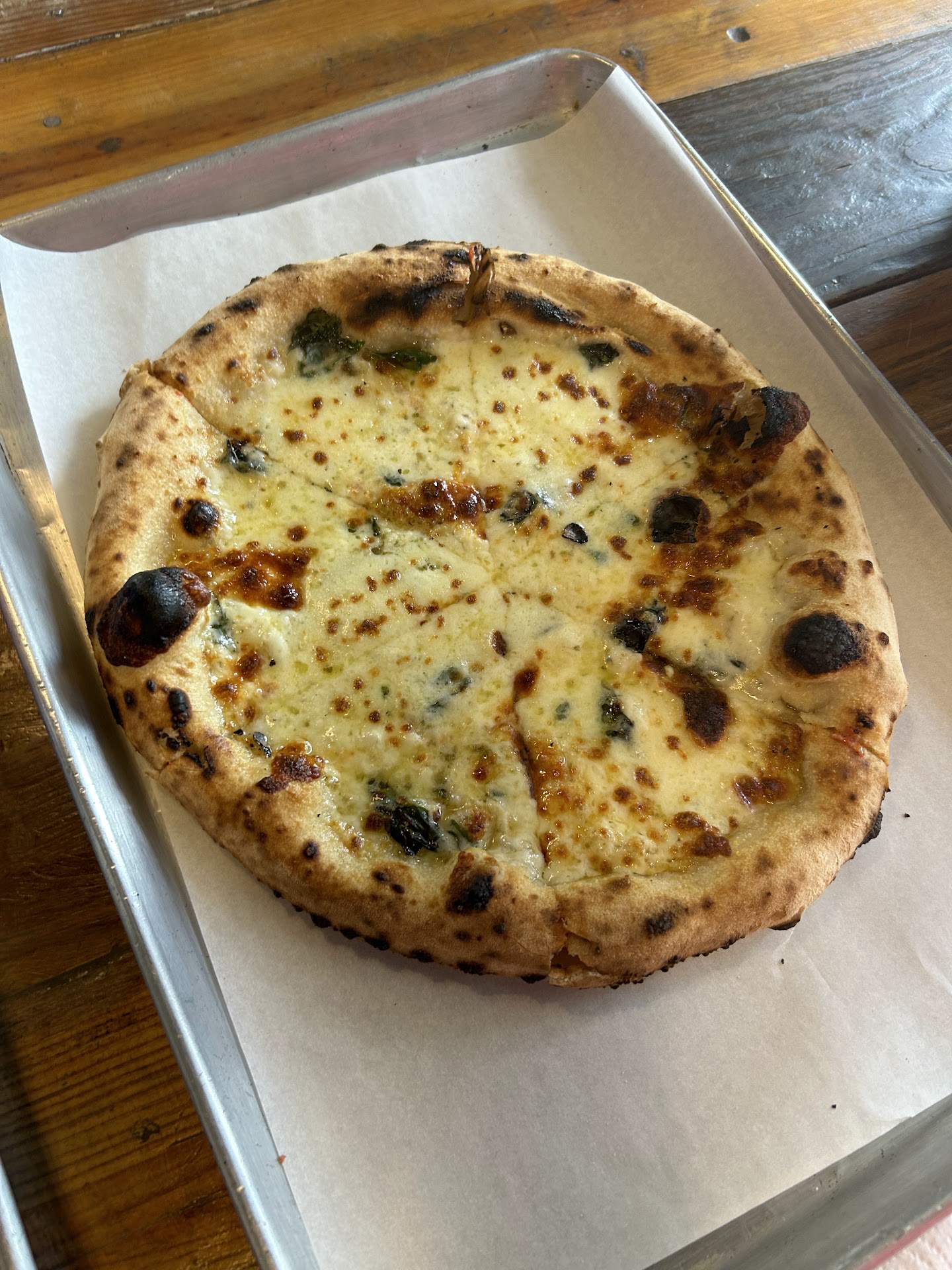 When the pizza arrived it was fresh out of the wood fired oven. Nice char in spots but the bottom was still a little under cooked. I ordered the classic pepperoni but had to search to find said toppings. Scarce and unevenly distributed.