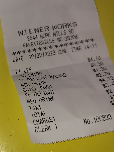 Read moreSo I've been enjoying Wiener Works since I was a little girl..about 20 yrs. The food has always been good to me but yesterday I decided to not go back. I pulled up and ordered...the lady was very nice. I ordered chilli 🍔 burger combo with no onions. I was told to pull up to the window for my total. (ps. They have great prices) I get to the window and the lady that took my order walks to the back and another lady from the back walks up to make my drink and I can hear her say, "oh that's with no onions." Then the lady hands me my bag of food. I bite into my burger and it's covered in onions...lol..no worries right? I'll just get back in line and get a new one. So I tell the lady at speaker, "I just came through a min ago and ordered the chilli burger combo with no onions and there was onions." And with an attitude she say, "pull around". Okay so I pull around and she doesn't say anything to me. Then she gives me my new burger and holds her hand out for my old burger all along not looking at me or speaking to me and moving with attitude. I go to ask for a fork and she walks away. Mind you she's still standing in the window view where I can see her and she can see me. I wave and say excuse me...and she continues to ignore me. I sit there for at least 30 seconds and she rolls gets eyes...finally I yell through the window "May I have a fork please?" She grabs a fork and sticks no more than her wrist out the window to hand me the fork. Horrible service. Fayetteville Winer Works on...