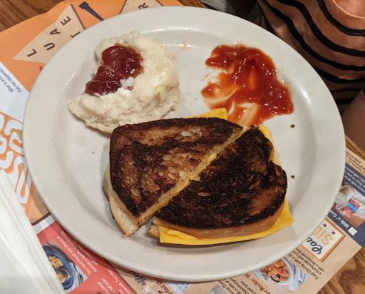 I try to avoid chains as I don't think the quality of food and service is as good as a one off local restaurant. My husband LOVES cracker barrel as it's one of the few local places he can get fried catfish. We were seated promptly and the table still had spots of food residue I wiped off with my hand. We waited about fifteen minutes for a server to ask us for our drink order. She was pretty busy with about four other tables. My husband ordered the fried catfish and I ordered the tips, shrimp and tenders combo with a salad and baked potato. We also ordered the cheese curds to share. The salad came first and is the thing I like most about cracker barrel. It was good. When the main food came, no dishes were removed and the table was getting pretty cluttered. I stuck a fork into one of the tips and it shot across the floor because it was dry. In addition the rest of the tips were in one connected mass. Almost like when. I buy meat prepackaged in the grocery store and flip it into the frying pan but never break it up. Once I could get one to stay on the fork, it was ok. It was very very salty and I like things pretty salted. The shrimp were small popcorn shrimp served in a condiment dish. Unfortunately mine had two popcorn shrimp and a few hush puppies I did not order so I missed out. The shrimp were pretty tasty! The chicken tenders had no dipping sauce so I used the ranch from the cheese curd dish (still on our table thank goodness) and couldn't eat them they were so dry. The chicken tenders were like jerky. The baked potato was ok. My husband's catfish was not cooked all the way in the larger piece so he had to stop eating it. The server was gone for long periods of time making it near impossible to get help regarding these issues. She did check in once and when I asked for a drink refill for my husband she brought back two drink refills (my cup was already very full and my meal complete) and a bunch of napkins and put them on the table. It felt like she was trying to put anything she could think we'd need on the table so she didn't have to come back. We waited another 20 min before the check was brought to us. Not an outstanding experience and we were not given an opportunity to correct anything that went wrong due to the time between visits from the server. We did however get a good laugh when the steak tip shot...