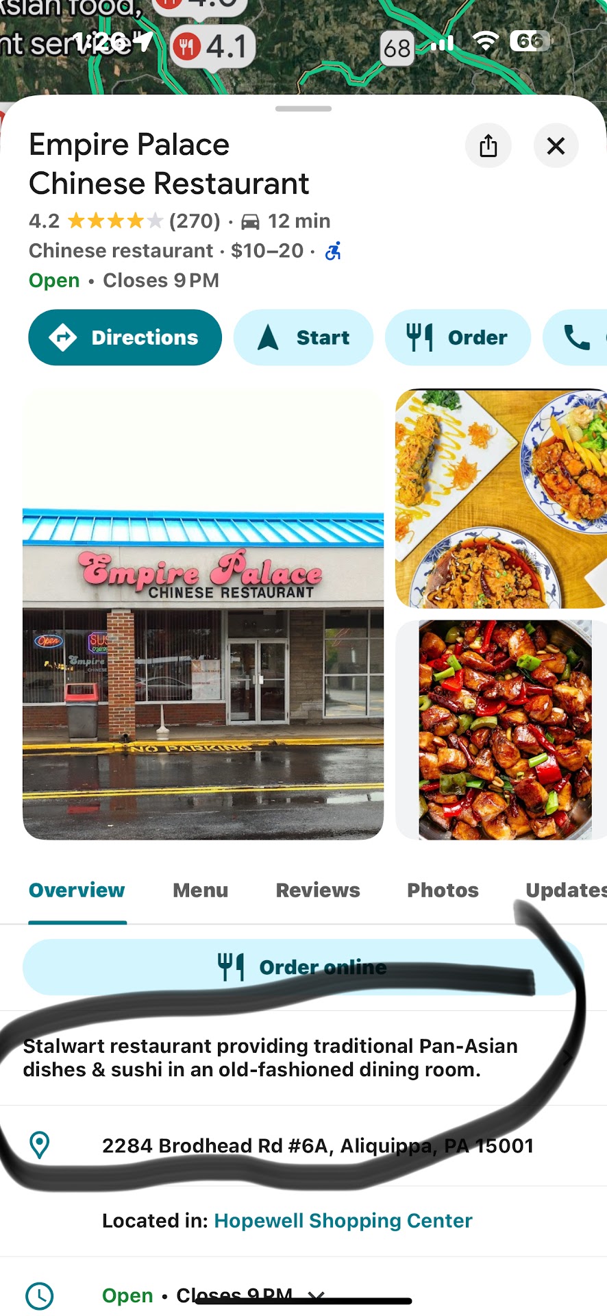 Read moreI am disappointed with the changes at Empire Palace. They have gone to carry out only. However, when my husband picked up the order they don't even give you plastic forks! We live in WV but was in the area so stopped for lunch. Had to take it home to eat, a 40 minute drive. The quality of the food has dropped, and the price had gone up.