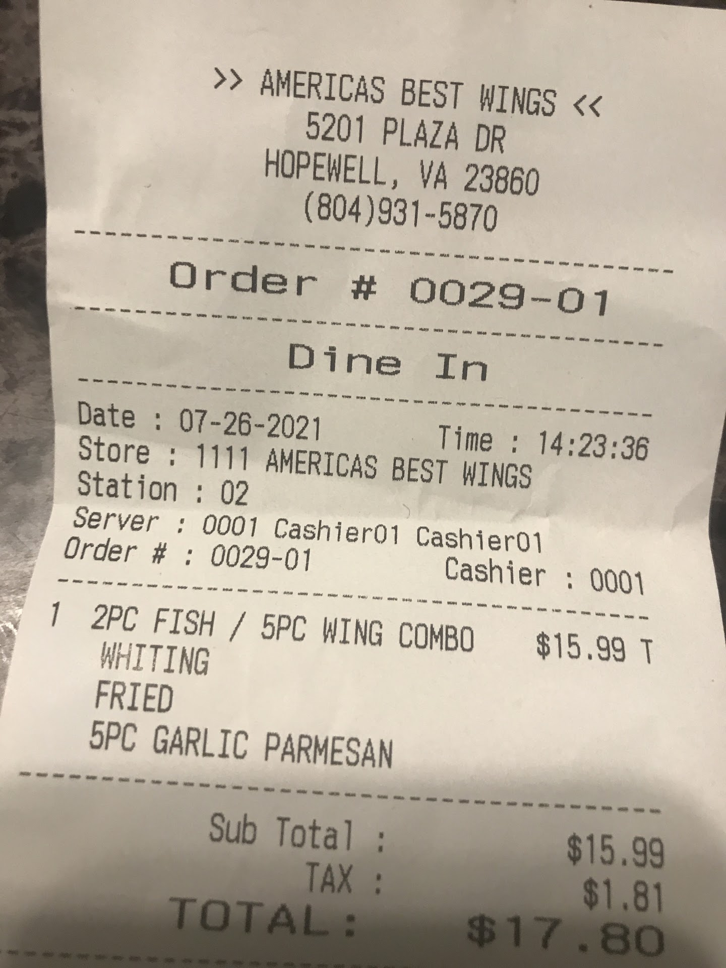 I ordered a fish and chicken combination plate first of all they did not have the new price posted on the wall I was not aware that the price had changed it was not notedâŚ. Second of all the fish that they gave me was not fresh it had a very bad aftertaste to it the french fries for soggy undercooked the combination said bread I asked the cashier he told me that it was hush puppies I was satisfied with that when I receive my plate it was light bread and the light bread was not even fresh Third of all I ordered a five piece chicken wings and they told me it was going to come with garlic Parmesan sauce when I receive the chicken wings it was a dry rub which I hate!!!! My thing is if youâre going to say that you are giving me a combo give me a combo if you charge me anything over $15 I expect to receive a full meal not a snack everything I order on this order the only thing I could eat was some of the chicken wings the fish was an edible the fries was undercooked the bread was hard and overall it was just not a...