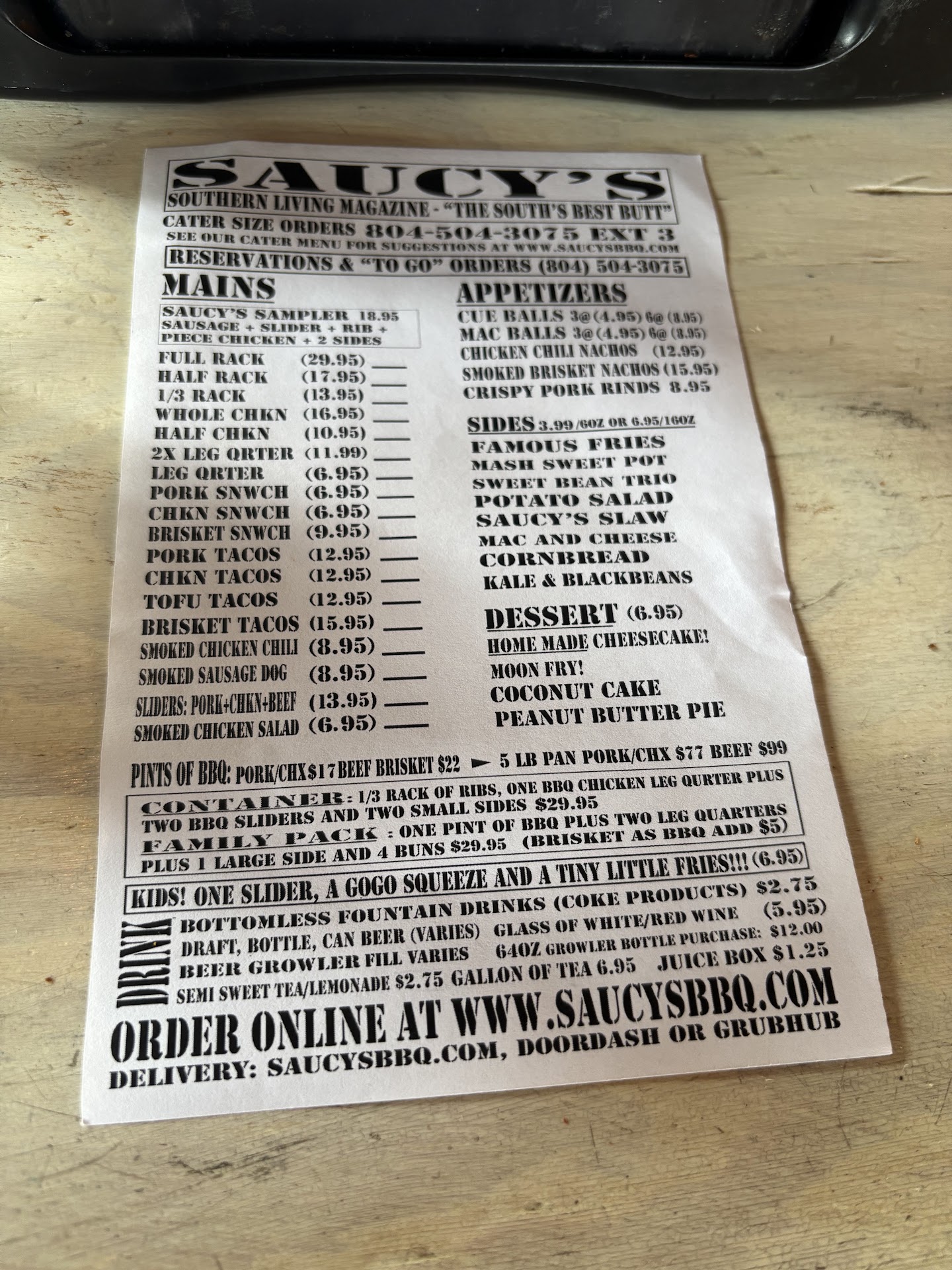 Read moreMy wife and I went to this location for the first time today. We enjoyed the food and the atmosphere was a little bit different, not much, but all in all this was a very nice restaurant. Some of the things we liked were the ribs! The ribs are off the chain, they were cooked well falling off the bone definitely get the ribs if you ever visit Saucy's. I had the brisket sliders and my wife had a brisket burger and they were very very good. The restaurant has a sauce that we pulled over everything :-). one of the unique things about the restaurant is the piping legs for the tables. We thought that was a little different but very nice. The chairs are regular folding chairs which are comfortable, but the tables sit High so if you're a tall person you may not feel in different however someone who is shorter they feel like they're sitting at a high table like they were 6 years old or something. This is a personal taste, but I I'm not a fan of the cold slaw. Nothing is really wrong with it however the oil / sauce that they put on it wasn't for my taste. I also (again my personal taste), the sausage link was not quite done enough for me, but Others May enjoy it that way. All in all we enjoyed the restaurant and we'll go again and try some other items. almost forgot, I tried the sampler which also came with a piece of chicken,...