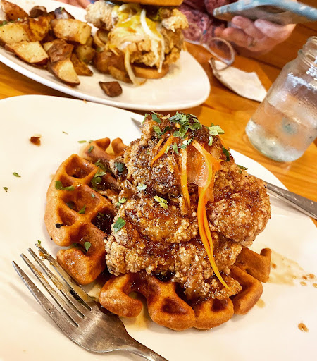 Read moreThere is not much in Hoquiam, WA. I find it a sleepy, depressed kind of town, with a side of grunge. I can't help it. I find it a place I don't particularly want to go to often, except for the fact that it is the home to one of the best little restaurants in the area: Brunch 101. I've been here a few times, and this place does not disappoint! From the friendly service, to the cute atmosphere, to the most incredible food! The outside doesn't look like much, but looks are deceiving! (Hmmmm, maybe Hoquiam isn't as grungy as i thought...?) This visit I decided to try the Chicken and Waffles with Thai Syrup, which is a dish I have been wanting to try for a long time. I usually get the Monte Cristo with its Carrot Cake Jam and a special request for a side of their Thai Syrup. (*side note: whatever you order, ask for a side of this syrup. It truly is amazing. I would take a bath in it, if it wasn't so sticky!!) I have to say, Chicken and Waffles has cleverly and deliciously nudged their way to the top of my favorite dish at Brunch 101. It was sublime. Excellent crunch to the moist and perfectly fried savory chicken thigh, paired with the sweet-spicy syrup soaked into the perfectly cooked waffle. Truly a joy on the taste buds. My friend got the Mother Clucker sandwich which consists of a Buttermilk Fried Chicken Thigh, Grilled Onion, pepperjack cheese, house pickle, topped with Country Gravy on a Brioche bun. (My friend substituted cheddar cheese instead of pepperjack). She was mmmmm'ing and aaaaaaa'ing throughout her dining experience. A home run for both of us! We both had anticipated bringing doggy bags home, but as we sat and chatted, and ate, and sipped our drinks and ate more and chatted more, we soon realized we were both past the point of doggy bags and powered our entire plates down! Not a drop left, and we both left feeling happy, but utterly stuffed. I don't normally do that, cause I hate the stuffed feeling, but goodness gracious, the food is so yummy, I couldn't stop myself! The chefs certainly know their food flavor profiles. Very creative, incredibly tasty, and utterly delicious. I forgot to take a photo of our Elvis Toast! Peanut butter, bananas, and bacon on sourdough with a drizzle of honey. Simple, yet so so sooooo good!! Perfect flavor profile! This is a joint that should be featured on the FoodTV Network with Guy Fieri! But, I think my review can't get any better than his! Get yourself up to Brunch 101 in Hoquiam, WA. They truly are a hidden gem worthy of...