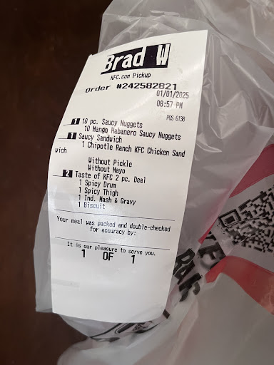 I get home and start getting my food and no mac and cheese. Not that big of a deal, It wasn't that big of a mistake, but when I get my chicken out it's all slimy and I can't pick it up without the skin falling off and dropping back in the bucket. Everything was "Original Recipe", but slimy, not even a hint of actual "original" quality that I've been used for the last 45 years that I've been eating Kfc.