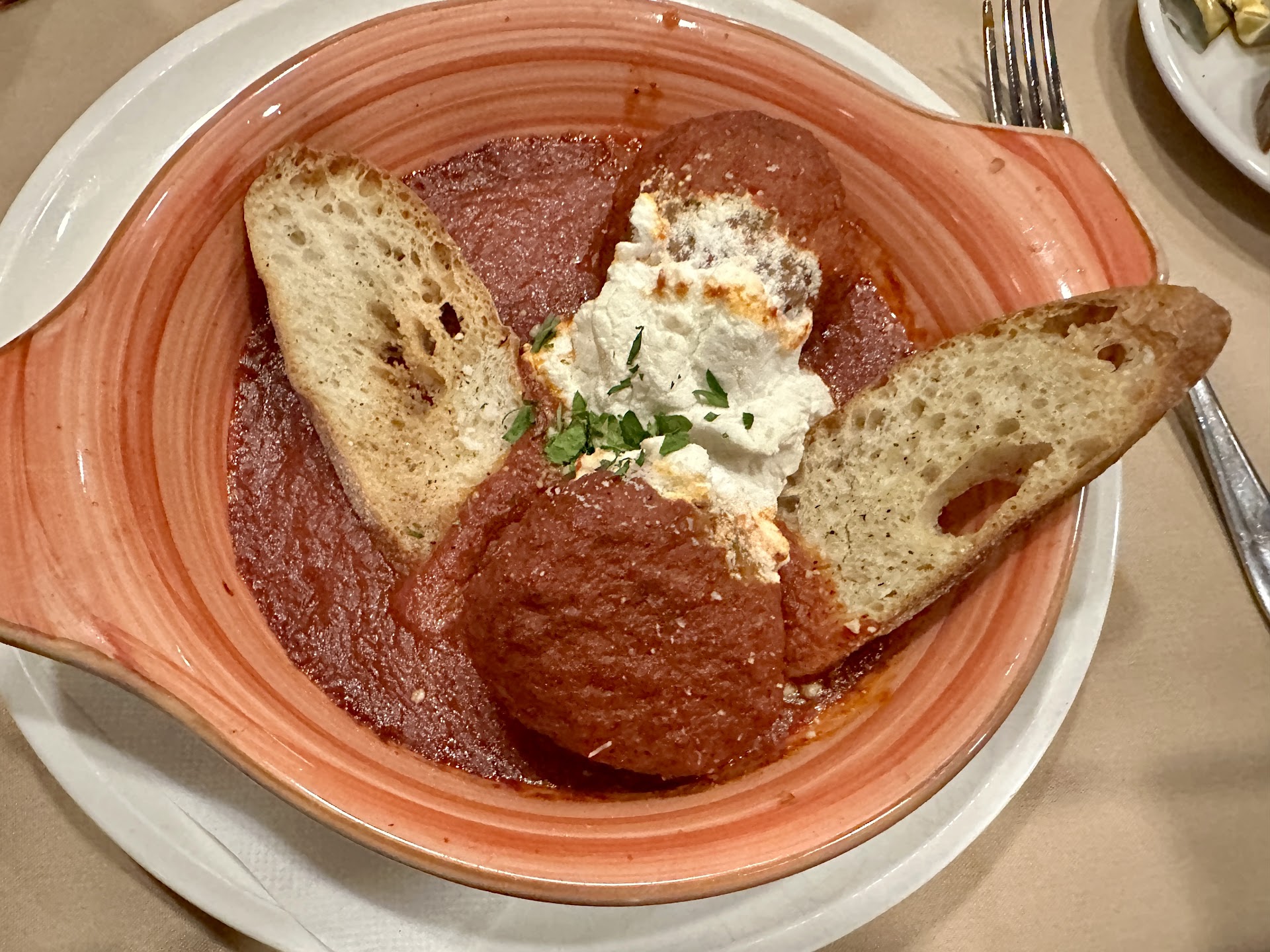 Service was fast and professional. Our server George was very attentive and personable, and he had plenty of help from the bussers/food runners. Dining room is bustling, but not cramped. Good quality, real Italian bread is served here, which is something most other Italian restaurants in the suburbs canât seem to manage. A plate of dried herbs and a container of olive oil is served with the bread.