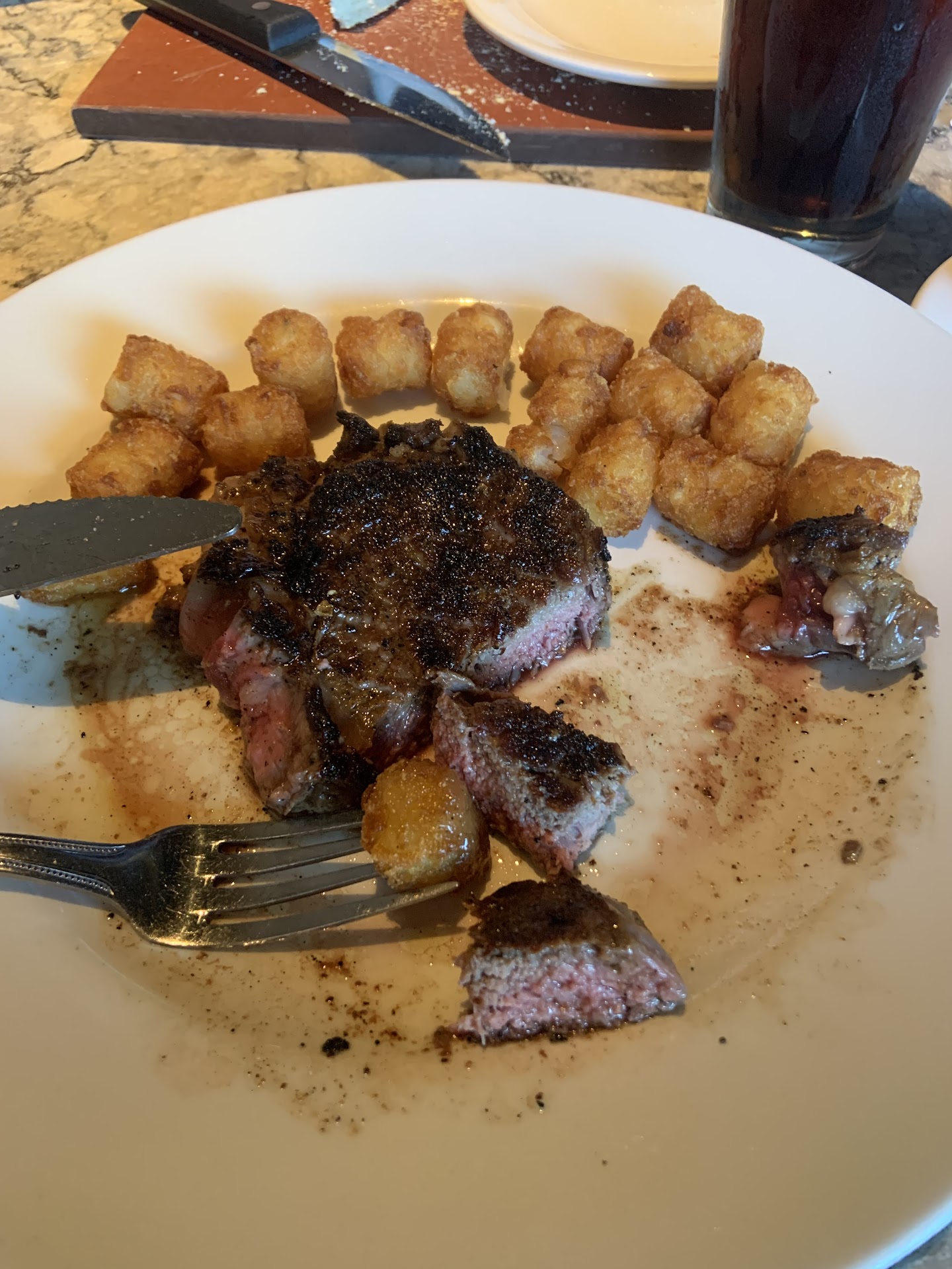 This place for a steakhouse is not inexpensive AND it is neither in the category of Texas Roadhouse (on the low end) or Ruth's Chris (on the very high end). Still a 12 oz. rib eye at $33.50 reasonably creates expectations that the quality and preparation will match the asking price. It didn't. It was ordered medium and came out medium more toward medium well. I politely asked the server to remain table-side while I cut the steak to determine if it had been delivered as ordered. I found it acceptable. The good news first; it was appropriately seasoned. The not-so-good-news; it was tougher than I expected from a rib-eye which is usually well marbled and inclined to be tender. The accompanying au gratin potatoes were tasty and hot, if not particularly eye-pleasing.