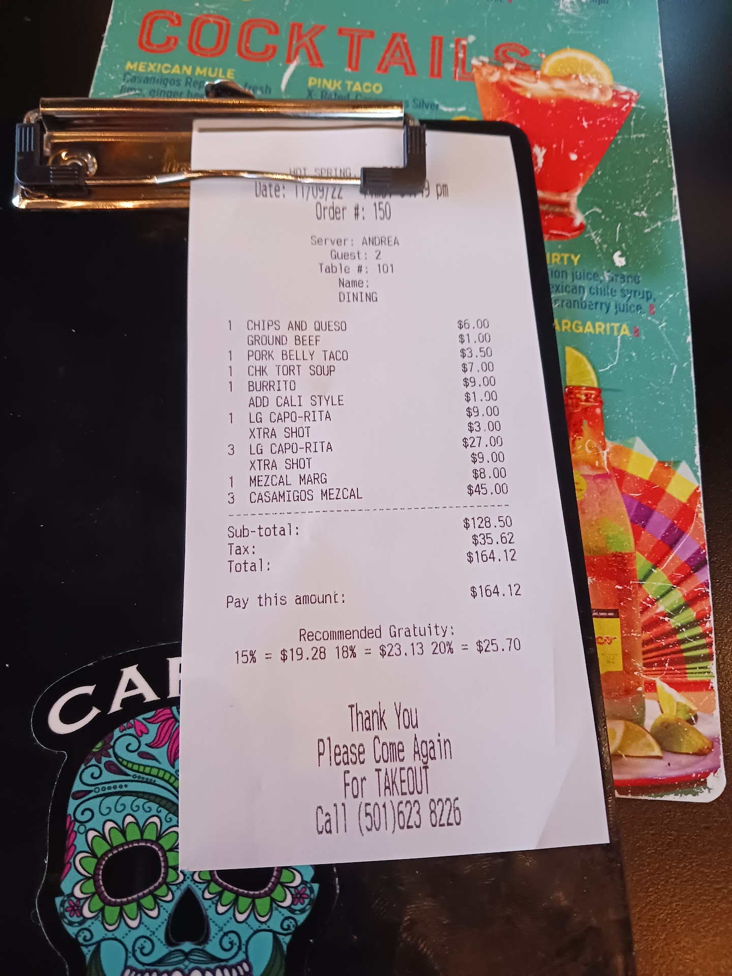 PSA--fraudulant charges after ticket was signed!! I went to Capo's Tacos on February 12 with a friend that lived in Hot Springs. We each ordered a grilled burritos and shared a cheese dip. The burritos were large, and tasted okay. Honestly they reminded me of the grilled stuffed burritos from Taco Bell. My friend enjoyed the cheese dip, but I found it a little bland. It consisted of cheese with spices on top that you mix in--perfect for my friend that cannot eat tomatoes that something like rotel would contain. We paid and left. When the charges came through my bank, the waiter had helped himself to a 40% tip. I did leave a tip but not 40%. I called the restaurant and spoke with a manager who stated that they would look at the tickets and see if he might have misconstrued the amount. She stated that this was not their custom and that they would make it right to me. She stated that she could do so food vouchers for me. I explained that I did not live in town, that my friend lived locally, but this was also the first time we had been to the restaurant. That it was not a good experience with the fraudulent charges from the waiter. She stated that she would refund my ticket, but had to check with the owner first. She called me back and and stated that there was no way the waiter could have misinterpreted the amount written and that the the owner agreed to write me a $5 check (instead of returning it to my card or the total refund the manager had mentioned ) and that it would go in the mail first thing tomorrow February16. I finally received the check (that was dated March 3) almost a month after the encounter. Not only was the staff dishonest, but the management did not have integrity. It wasn't amount of the situation, it was the principal and the owner failed to see that. So make sure you check your bank statements if you...