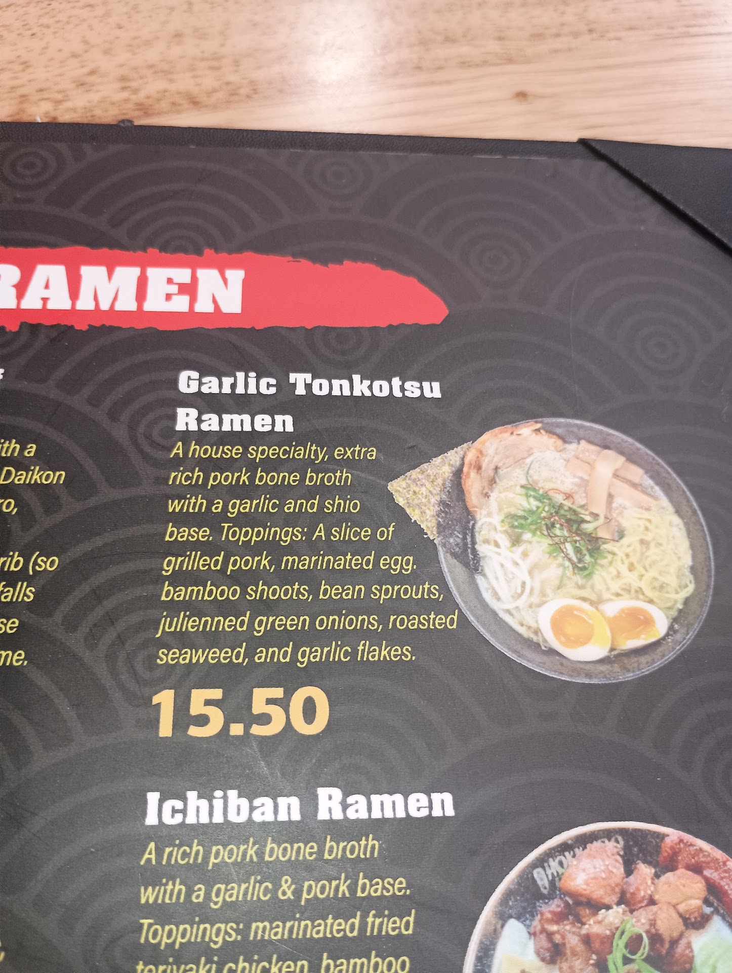 food.: 4.9/5 I admit, I didn't know what to expect I'm not usually into this line of food so i was a little put out about the price until I saw the size of the bowl he ordered the Miso ramen, I ordered the garlic.. admittedly I had to ask them to add more garlic to mine, it seemed kind of bland... but adding garlic was easy enough and really made the difference!