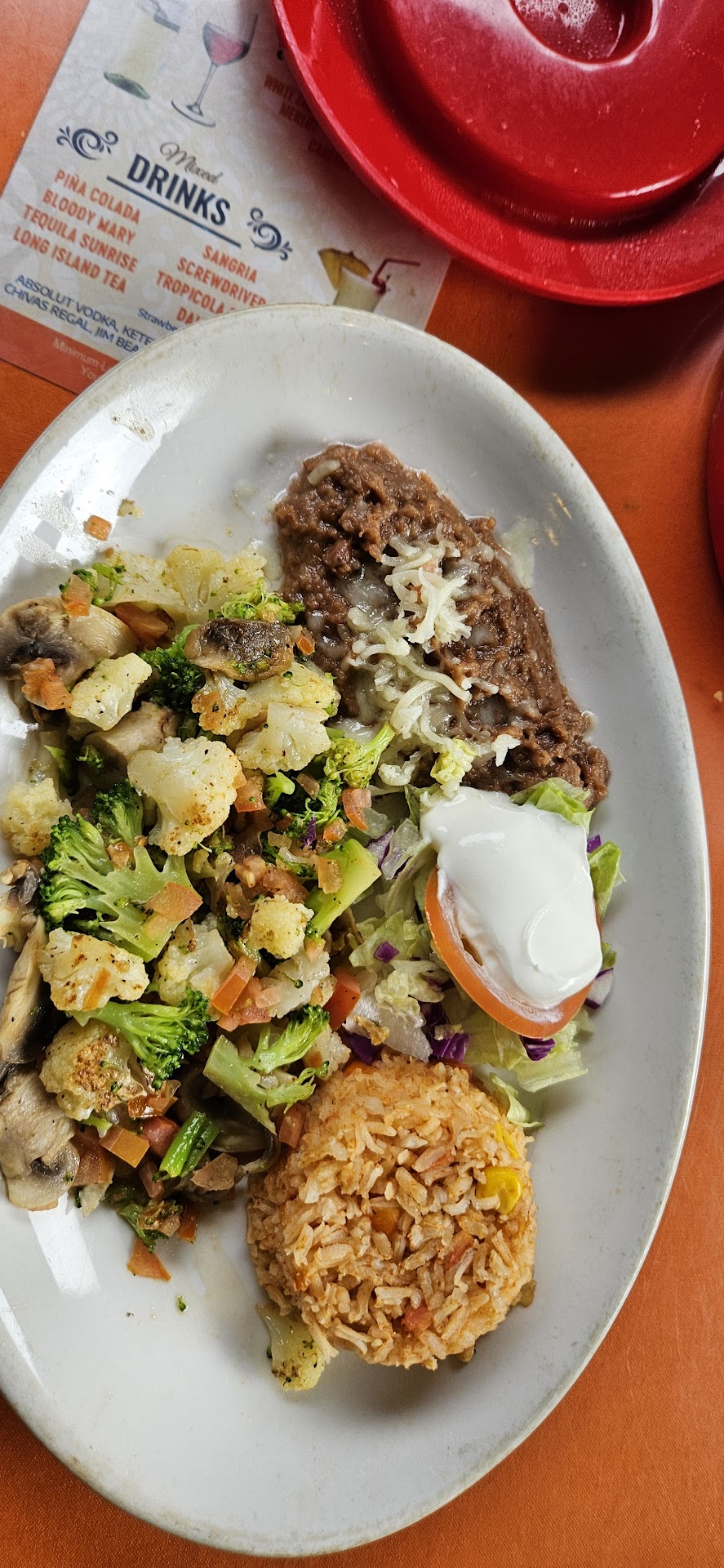 My partner ordered the vegetable chimichanga with beans and rice. The chimichanga was missing the red peppers that it was supposed to contain, and the veggies inside were mushy to the touch. On top of it all, the chimichanga was too greasy and not drained properly.