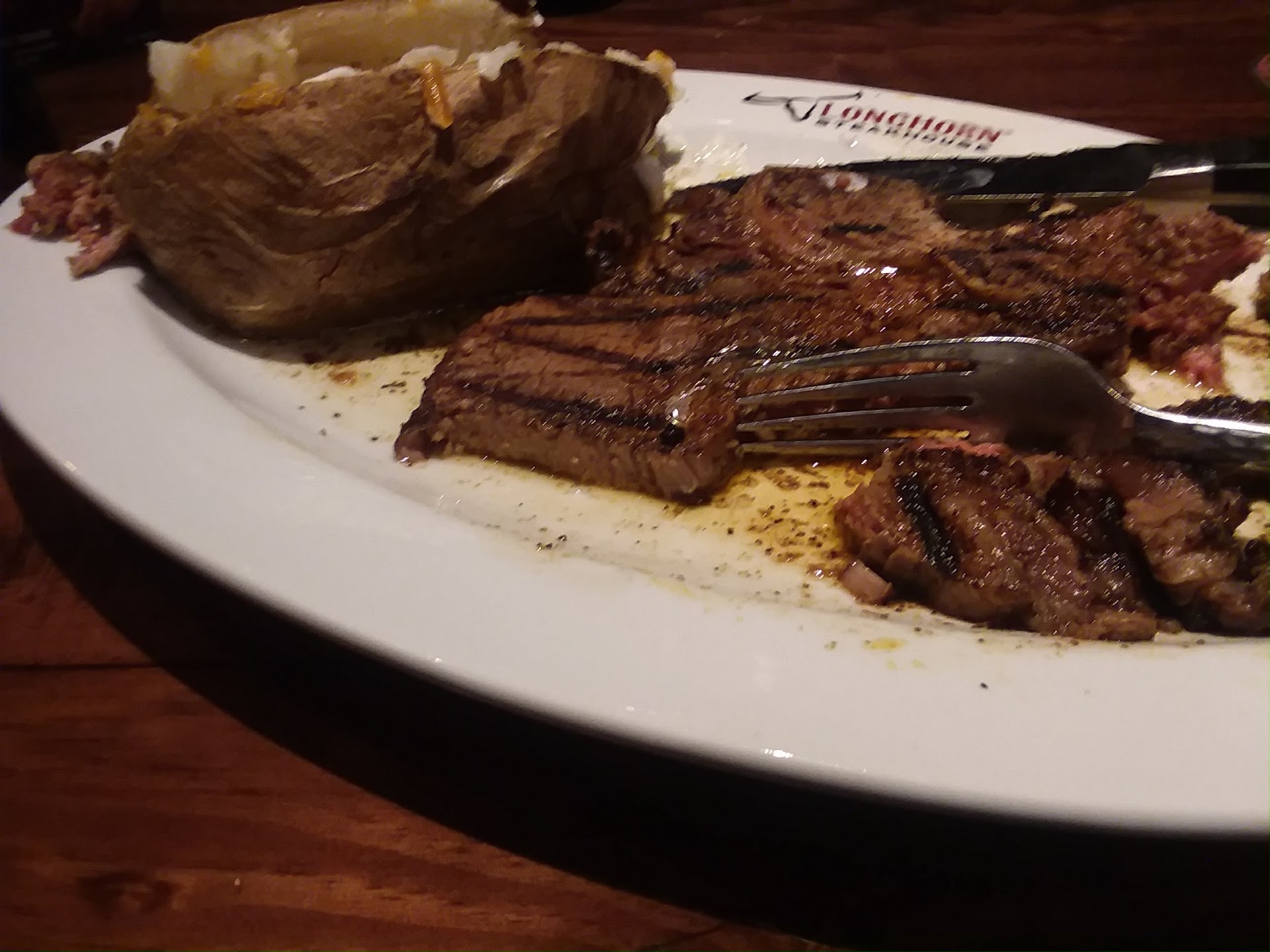 Read moreI've been to Longhorn five or six times over the last few year. the first time I received my porterhouse steak I requested medium rare and received rare and send it back. The next time I ordered medium and got medium rare which is what I wanted, but I did notice thickness of the meat was good. The next couple of times I was impressed. But this last time and once before I have found that the meat was getting to thin, no more than 1/4 inch thick. (Saw on Food Channel a porterhouse between 3/4 or 1/2" thick) And it was overcooked which is easy to do when the meat is that thin. I did not complain at the time because I didn't want to thank that I was looking for something more than to let you all know. I do not like the thickness of your meat the last two times. I had order a porterhouse every time I go. I know you go by weight so maybe to make a smaller around and thicker would be preferable to the Big, thin, flat piece of meat that was on my plate, or maybe go up on your 20 oz restriction. Having it floating in a pool of butter, doesn't help. So if you start cutting your meat thicker let me know and I may come back one more try.