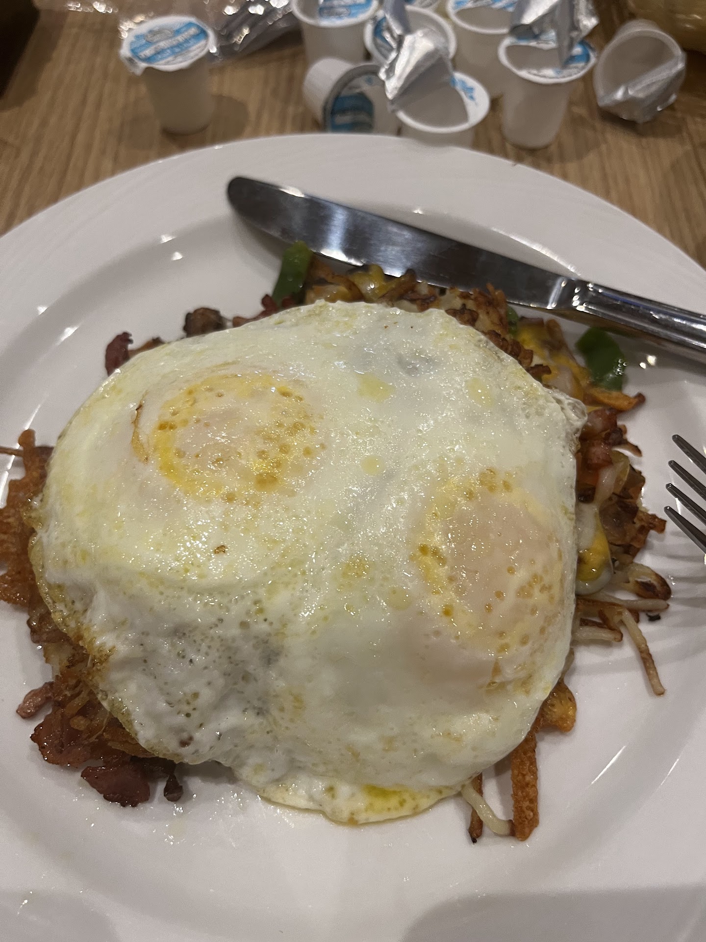 Read moreSinking ship. They really had the communities hearts in the beginning with their pizza sized pancakes and large portions. But now, you pay $3.50 for a bottled orange juice that is probably 75. Cents at the store and it’s a generic brand. Let me explain my disappointment. Took a friend there last week, this friend is a great member of our community, he requested chicken with his scrambled eggs since he doesn’t eat pork. Pork seemingly being the only breakfast meat options available. And I asked for a bacon egg and cheese sandwich. It took almost an HOUR for our order to arrive to the table and there were only 3 other customers, two whom had been there before we arrived. The kitchen staff stood around the window and talked, laughed and discussed personal issues. At one point we noticed the three other customers becoming impatient as well since they two others that had been there before we arrived were actually still waiting on their food until just about three minute before we got our food. When we asked the waiter what’s taking so long, he said they were “cleaning”. In the middle of breakfast service you stop cooking to clean??? It was like 9am. Ok I received my breakfast sandwich and it was BLACK!! Burnt!! The waiter sat the plate on the table and I immediately picked my plate up and sat it back on his serving tray. I just looked at him and calmly said “it’s burnt”. I mean seriously? I waited an hour for that? My friends breakfast came with a pancake and it was literally the size of an English muffin. His chicken was that precooked, processed, fake chicken. And it was dry as helll. What is going on???? They didn’t bring syrup, butter or any jam. I am not sure what is going on, but this is part of the casino, and the casino is the biggest business in town. Let me tell you, this is pathetic. I hope they are not proud...