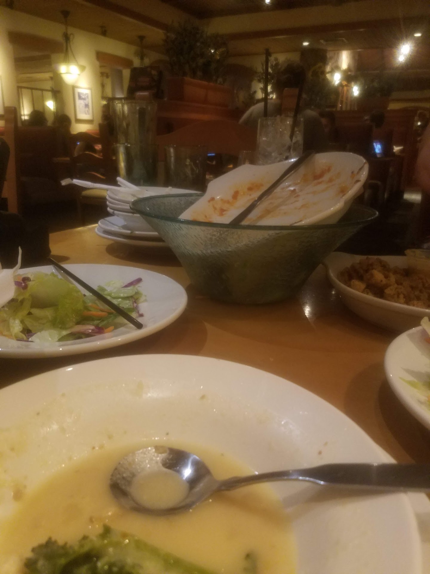Read moreWe were so disappointed with our experience here tonight. First off, our favorite things have been taken off the menu which was a little disappointing, but I know you have to change things up and so I reviewed the menu and chose to create my own with the new mushroom sauce, my husband ordered the cheese ravioli with meat sauce and our son ordered a fettuccini alfredo and specifically told the waitress he did not want chicken. We oredered drinks; coke, DP, and a raspberrny tea. We got a coke, DP and Raspberry lemonade ....... Had to have a diff waitress bring the correct drink. I ordered the zuppa tuscana, my husband ordered the chicken and gnocci and my son asked for salad. Our soups and salads came. My soup was watery to the point of no flavor. The chicken and gnocci had no gnocci in either bowl that my husband oeorder. It also had no flavor. My son had no complaint on the salad. Before our food arrived the waitress came back and filled my husbands drink, forgot mine. I had to ask her to get me a refill. She also came and asked if us if we would like all of our meals to come out together or wait for mine to be made. Of course, we said we would wait. 5 minutes later all the food was there. Not really sure why we were asked to wait if it was pretty much done? My son's fettuccini came with the chicken he didn't ask for and specifically said not to put on it and tasted more like heavy whipping cream with a hint of cheese in it. My husband's ravioli was so dry he could barely cut it. My pasta had barely any sauce or mushrooms in the "mushroom sauce". Also, it was tasteless. Absolutely tasteless. Even the chicken that I did ask for was tasteless. Not sure what happened in the last 6 months, but ew! Not one dish was removed from the table during the course of the meal. Thank goodness we didn't have our daughter with us or the wouldn't have been able to eat for the mess and lack of table space. As we were getting ready to go our waitress asked of we would like to go drinks. My son took her up on that and asked for a raspberry tea. She repeated his request and still brought a lemonade. We had been looking forward to this all day and left feeling hungry and ripped off. I will say that our waitress was a very sweet girl. Maybe she...